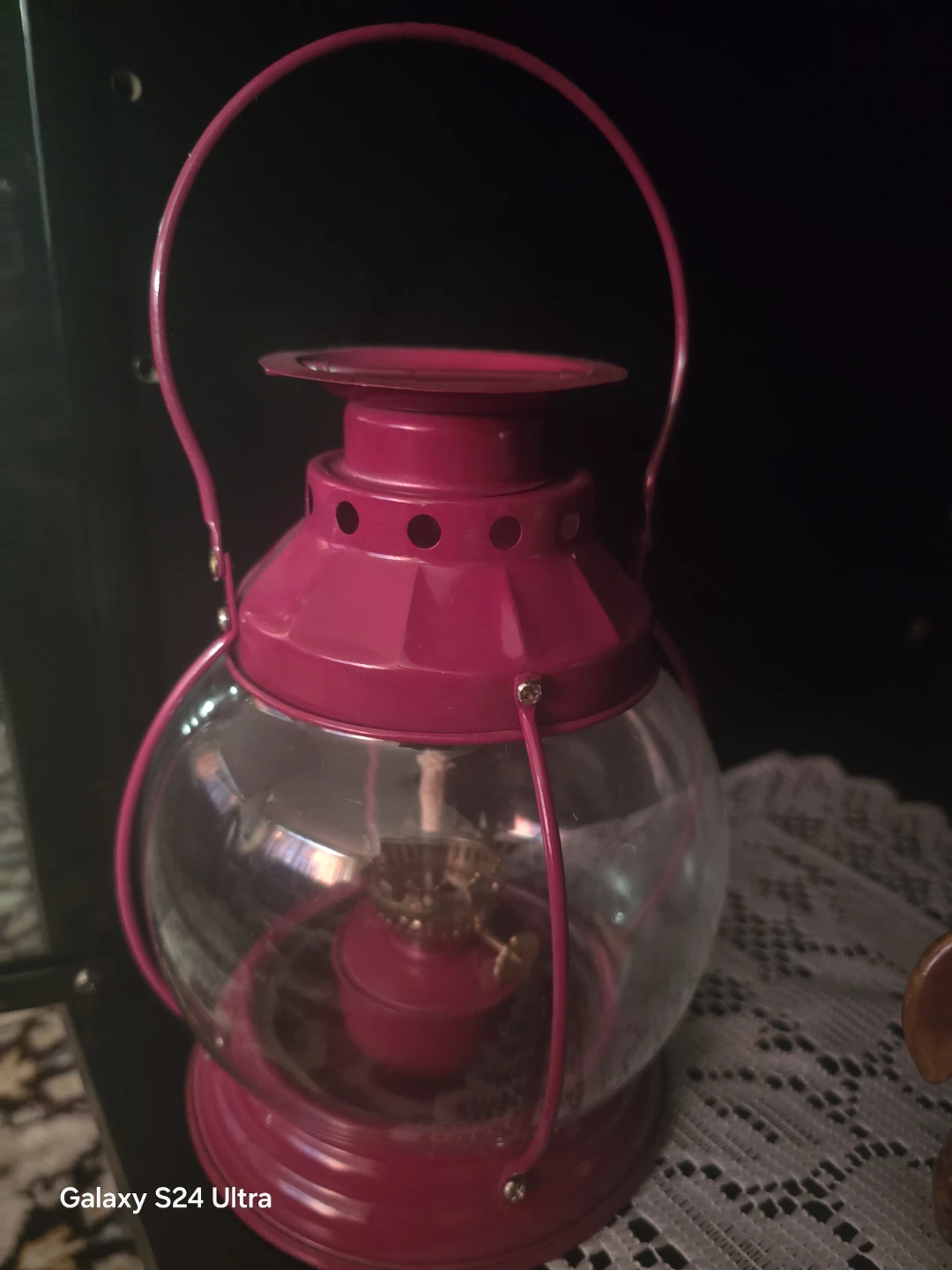 A cute pink decorative lantern with a clear glass globe. It's in great condition and would add a nice touch to any room