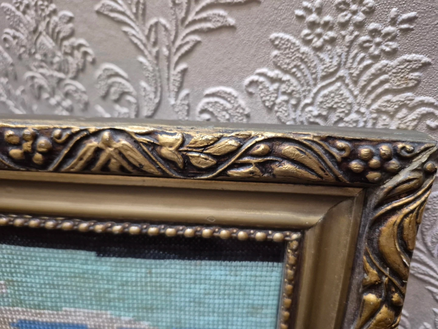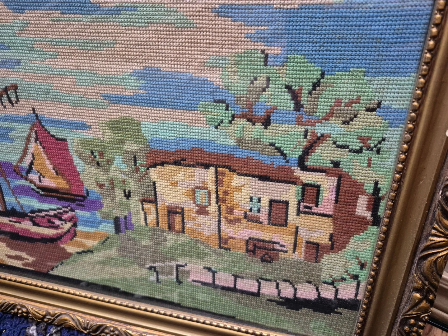Charming vintage framed tapestry artwork depicting a colourful coastal scene with a sailboat and buildings. It's a detailed needlepoint piece. This wall art would add a touch of classic decor to any room.