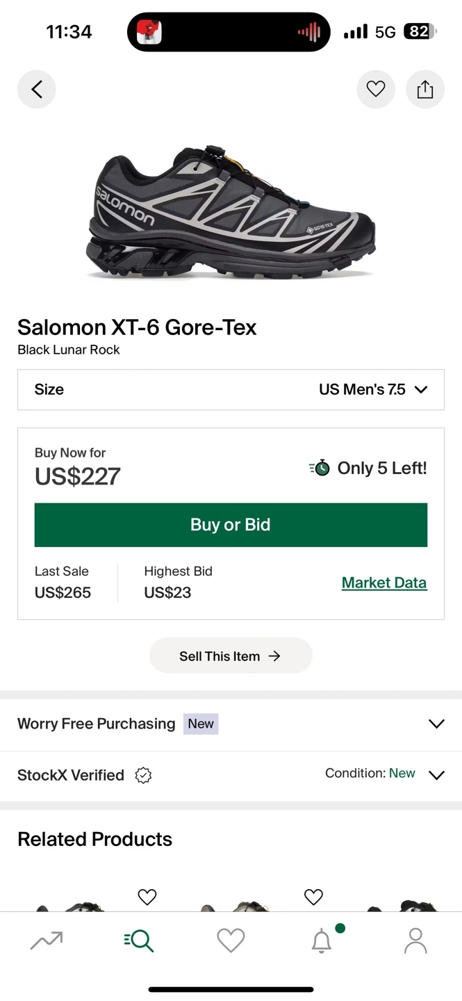 Men's Salomon XT-6 Gore-Tex trail running shoes. Black Lunar Rock colourway. Size 7.5. New condition.