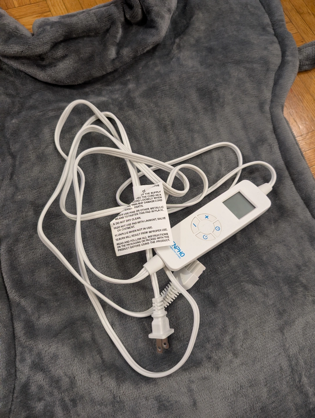 Grey heating pad for neck and back. Features a digital controller. Auto shut-off function. Machine washable. Includes power cord and instruction manual.