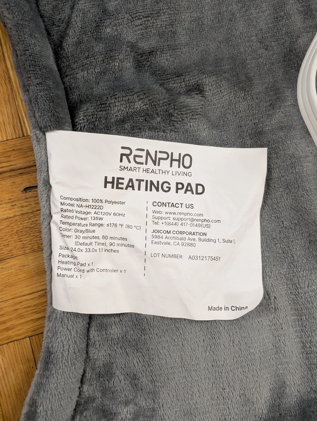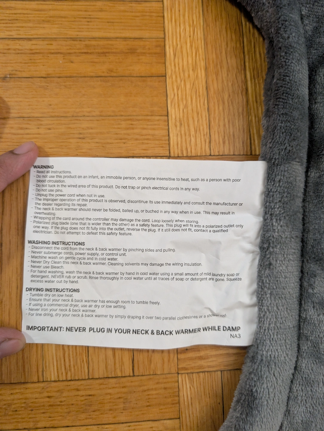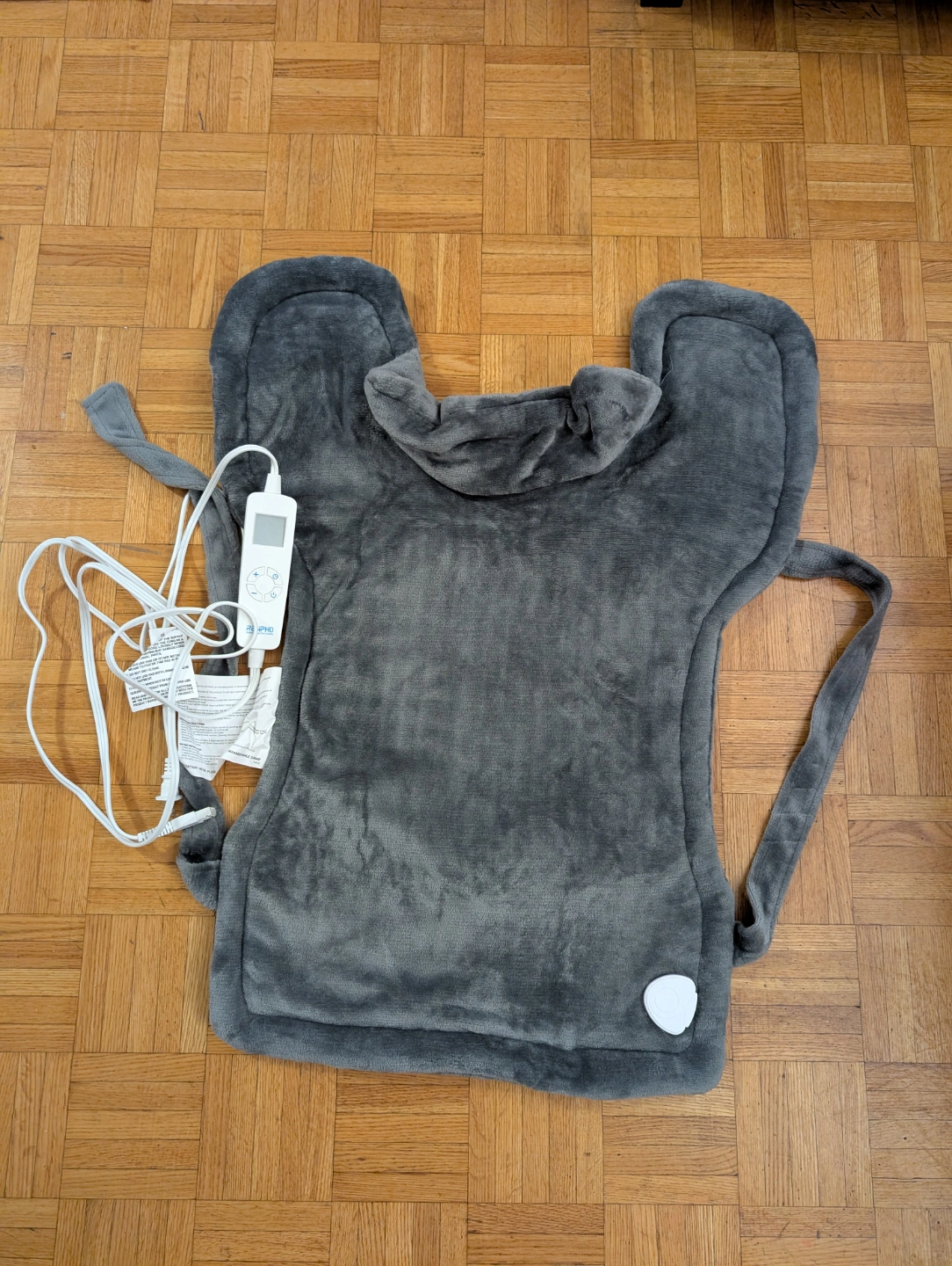 Grey heating pad for neck and back. Features a digital controller. Auto shut-off function. Machine washable. Includes power cord and instruction manual.