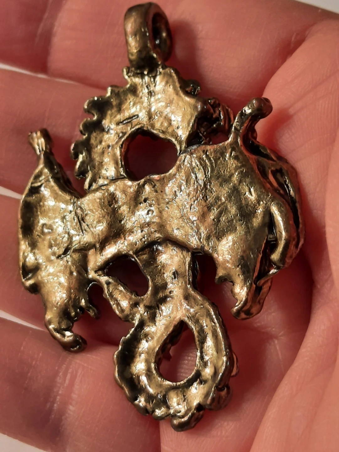 This dragon pendant has a copper-toned body with metallic silver and gold wings. It's a unique accessory. The pendant is made of metal. This piece would appeal to fantasy enthusiasts.