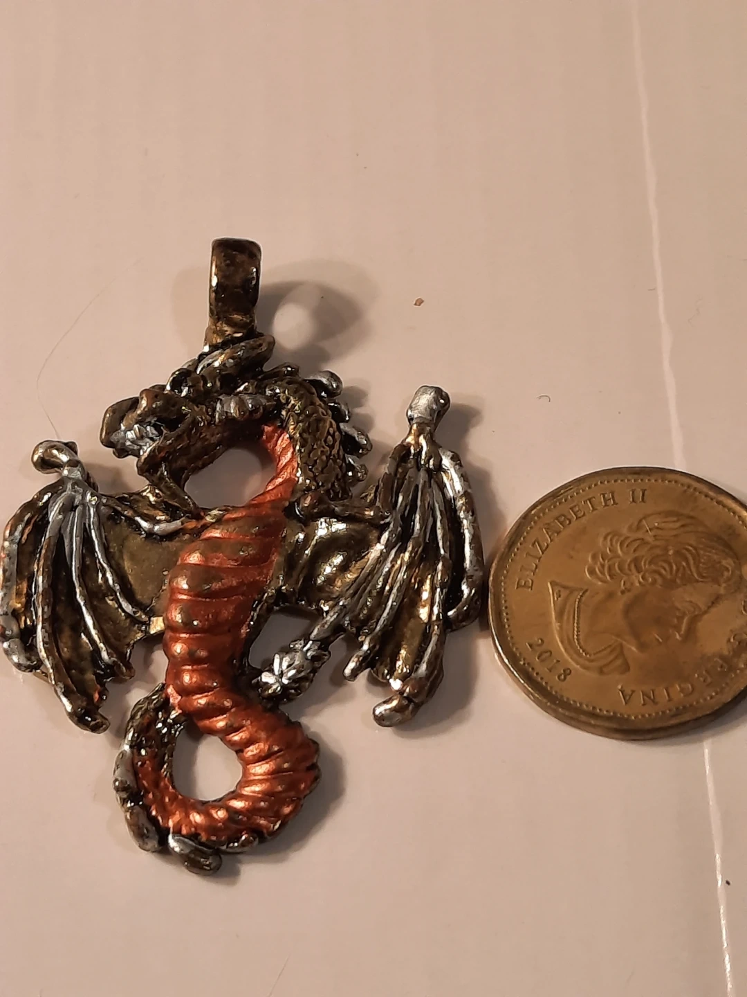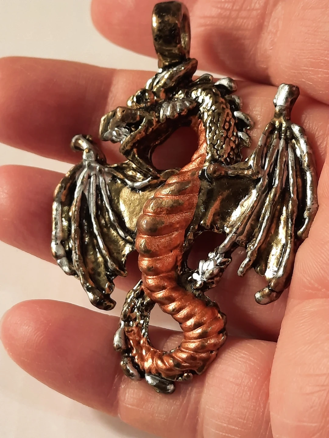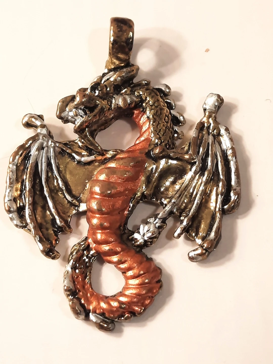 This dragon pendant has a copper-toned body with metallic silver and gold wings. It's a unique accessory. The pendant is made of metal. This piece would appeal to fantasy enthusiasts.