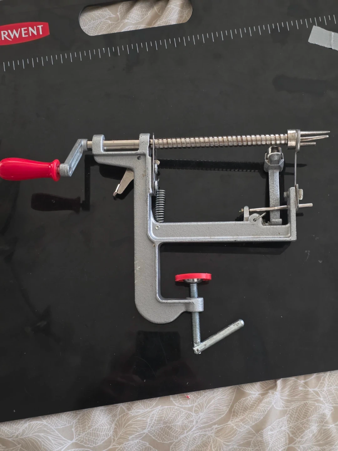 This is The Pampered Chef apple peeler, corer, and slicer. It's made of metal with red handles. Attaches securely with a clamp base. It's a handy kitchen tool for preparing apples quickly!