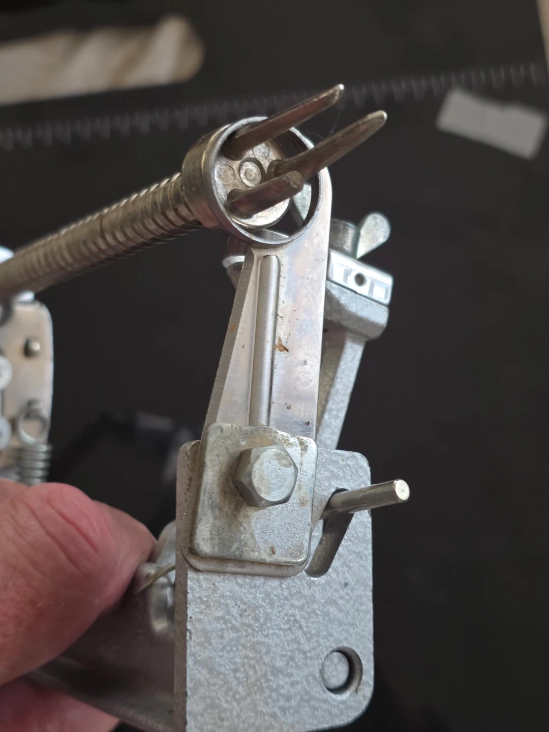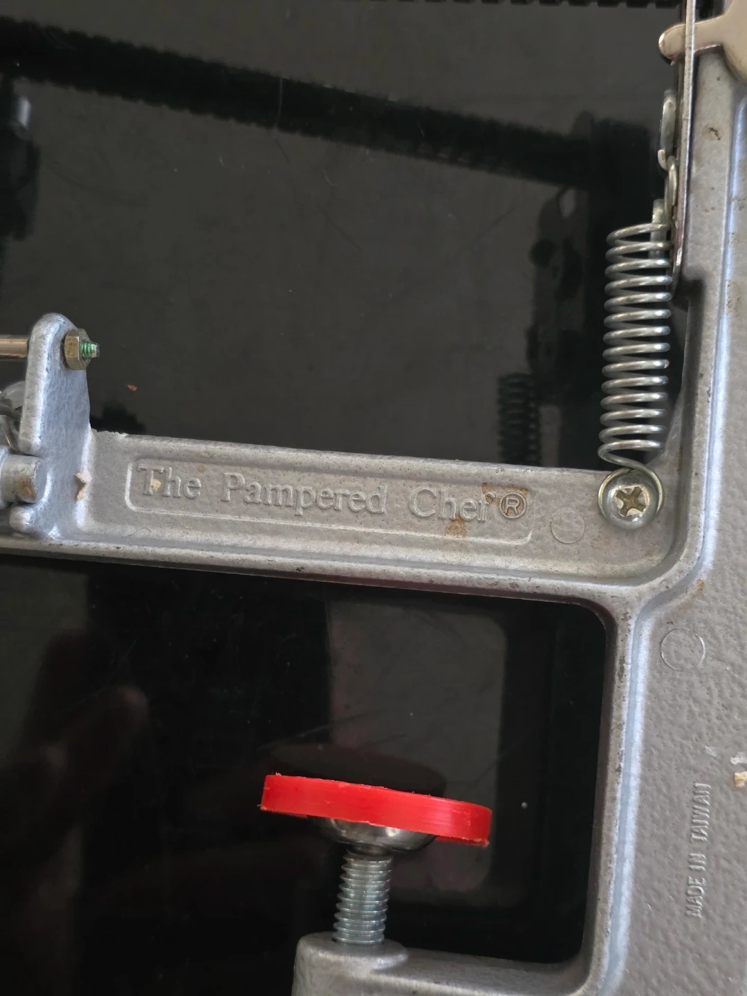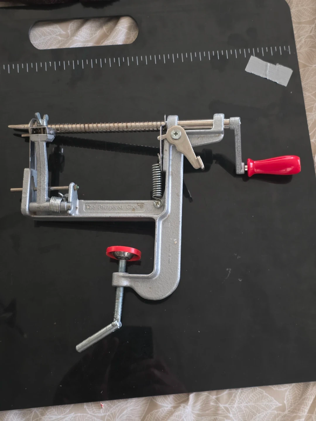 This is The Pampered Chef apple peeler, corer, and slicer. It's made of metal with red handles. Attaches securely with a clamp base. It's a handy kitchen tool for preparing apples quickly!