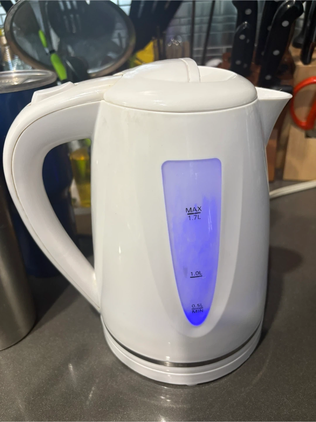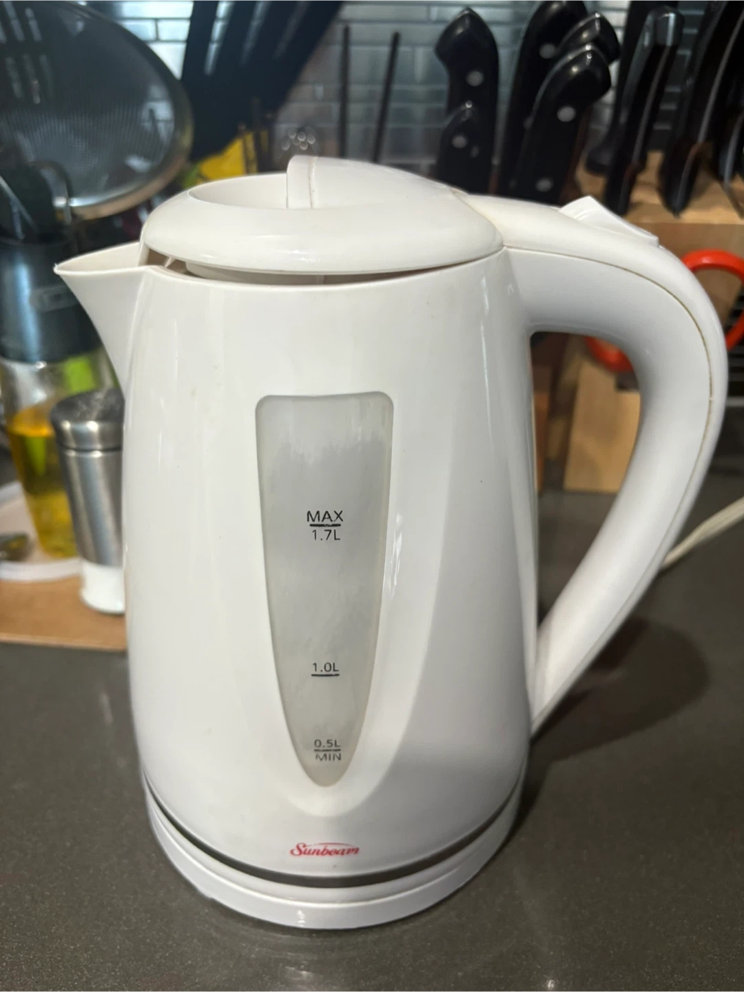 Selling a Sunbeam electric kettle. It has a 1.7L capacity and a clear water level indicator. It works perfectly. A little bit of discoloration inside which you could try clean with vinegar