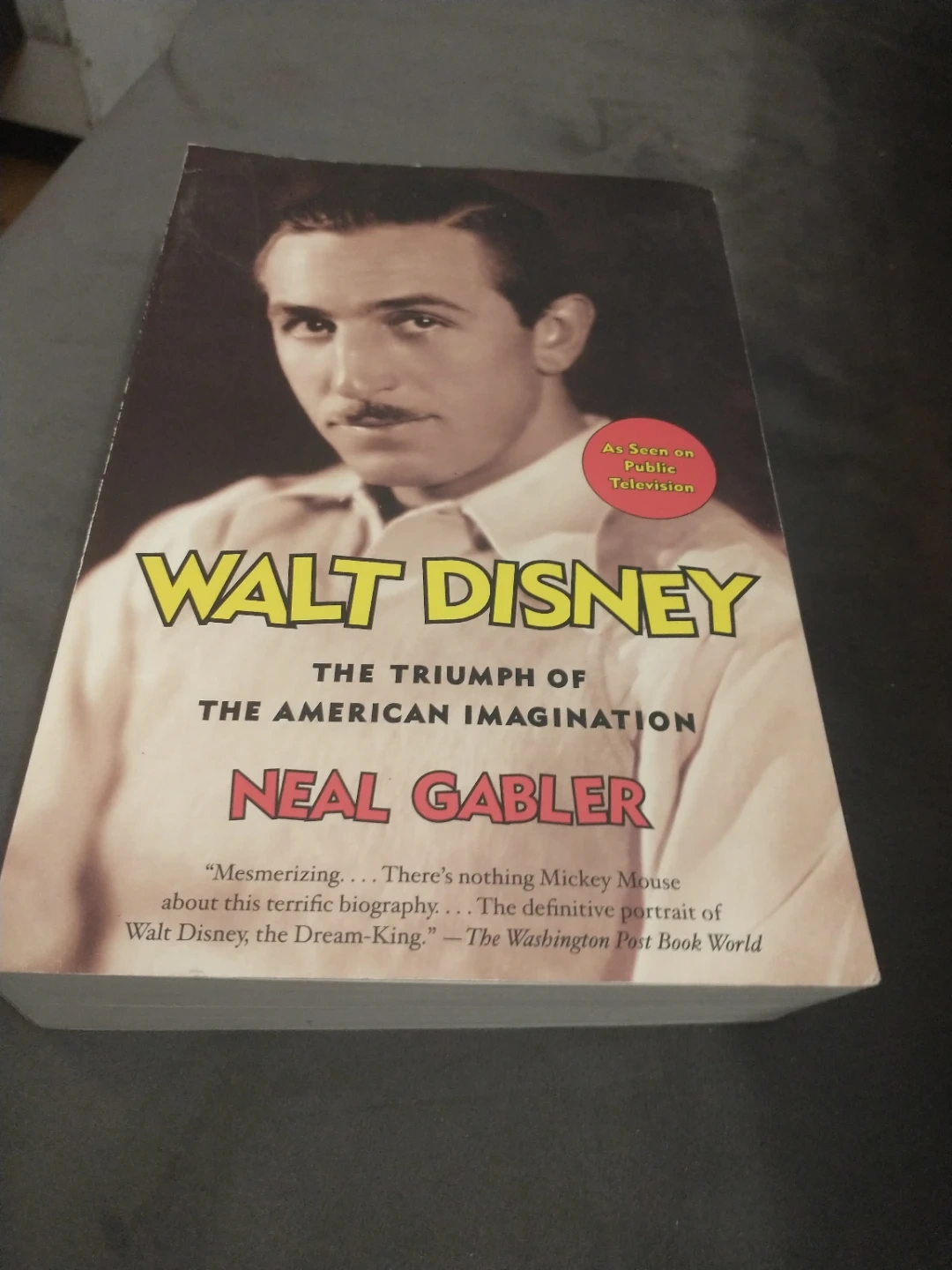 This is a softcover biography titled "Walt Disney: The Triumph of the American Imagination" by Neal Gabler. It provides a definitive portrait of Walt Disney. The book has received praise from The Washington Post Book World. 849 pgs.