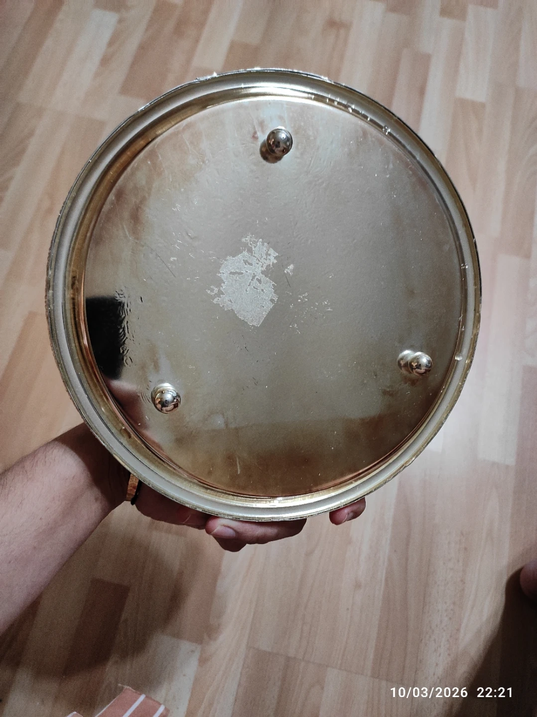 This decorative serving tray has an intricate embossed pattern on the surface. It's made of metal with a silver-tone finish and rests on three small feet. The ornate openwork border adds a touch of elegance. Perfect for serving snacks or displaying small items!
