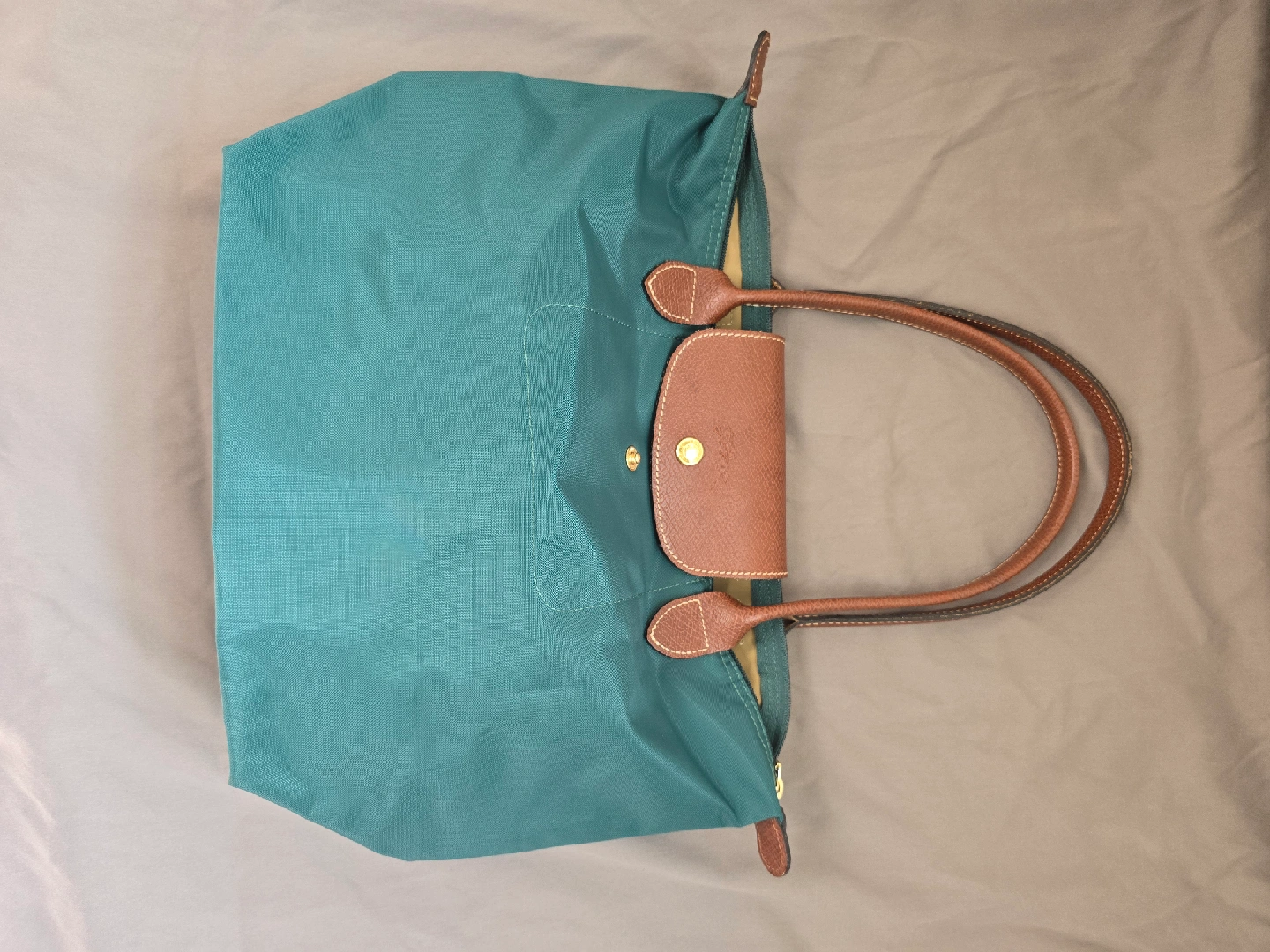 Selling a Longchamp tote bag in a beautiful teal colour. It's in good condition and perfect for everyday use. There is a small scratch on the leather closure. It's lightweight and easy to carry around!