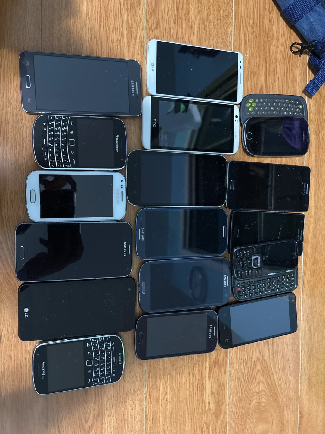This lot includes several smartphones and feature phones from brands like Samsung, LG, HTC, and BlackBerry. They're all in varying conditions. Some are touch screen models, while others have physical keyboards.