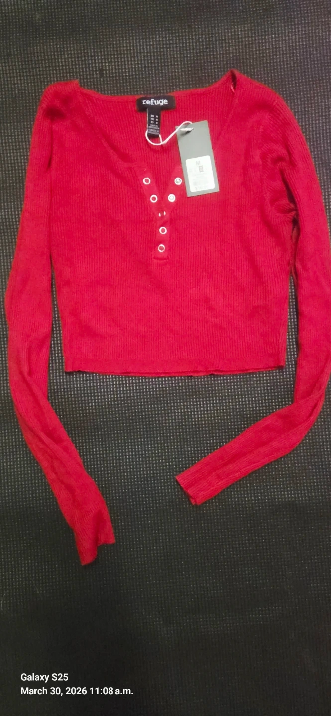 This is a brand new Refuge long sleeve crop top in a vibrant red colour. It's a size medium and features a ribbed texture with a button-up neckline. It originally retailed for $16.00.