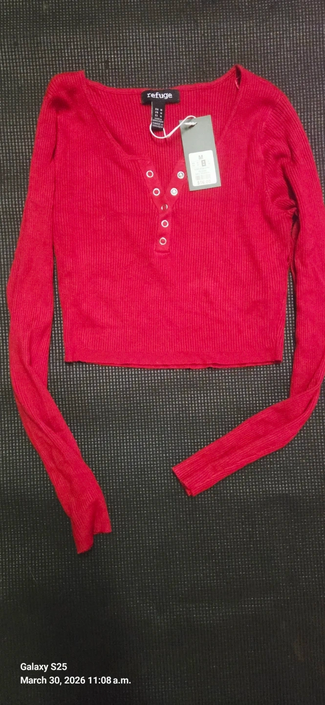 This is a brand new Refuge long sleeve crop top in a vibrant red colour. It's a size medium and features a ribbed texture with a button-up neckline. It originally retailed for $16.00.