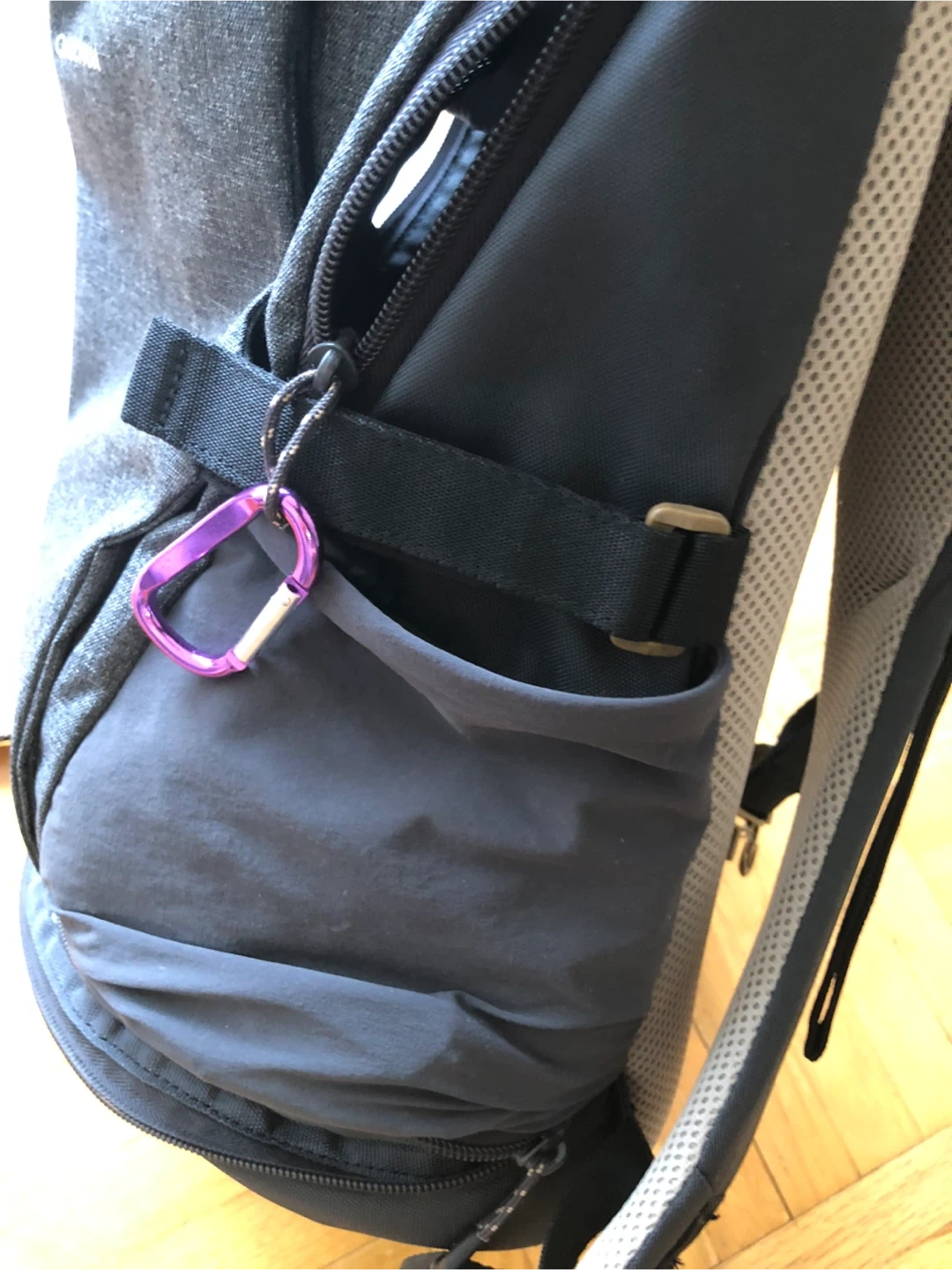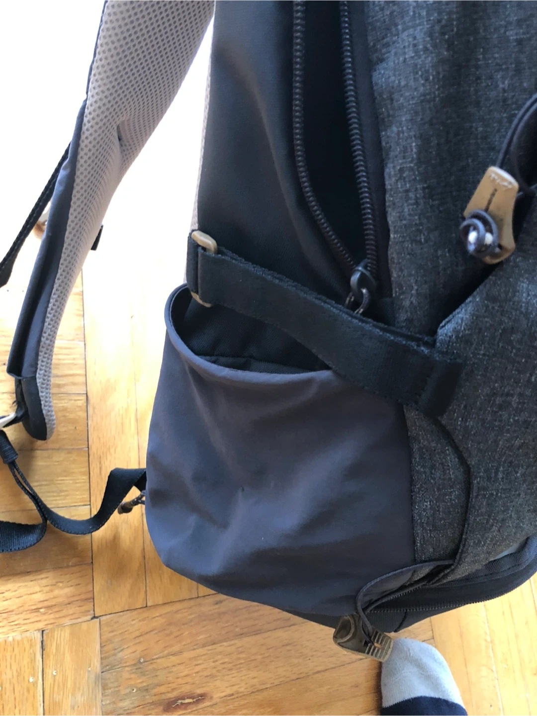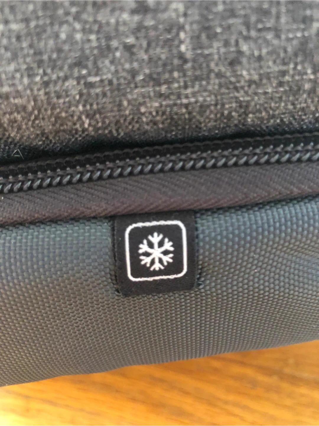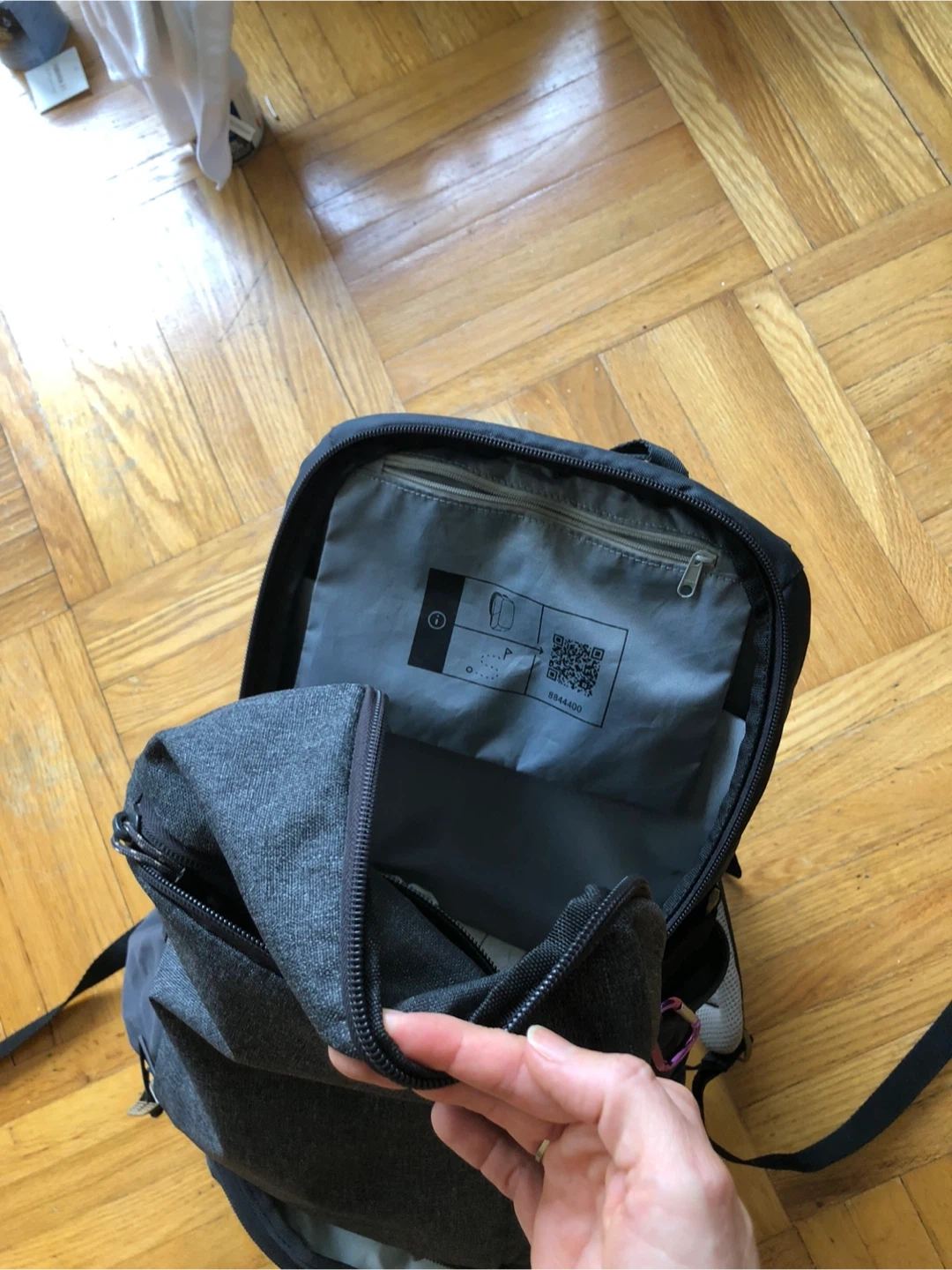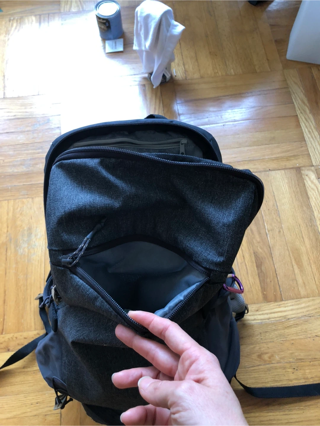 Grey Quechua backpack with multiple compartments, at the bottom has a cooler compartment for your cold drinks after the hike! It's made of durable fabric. Great for everyday use or short trips!