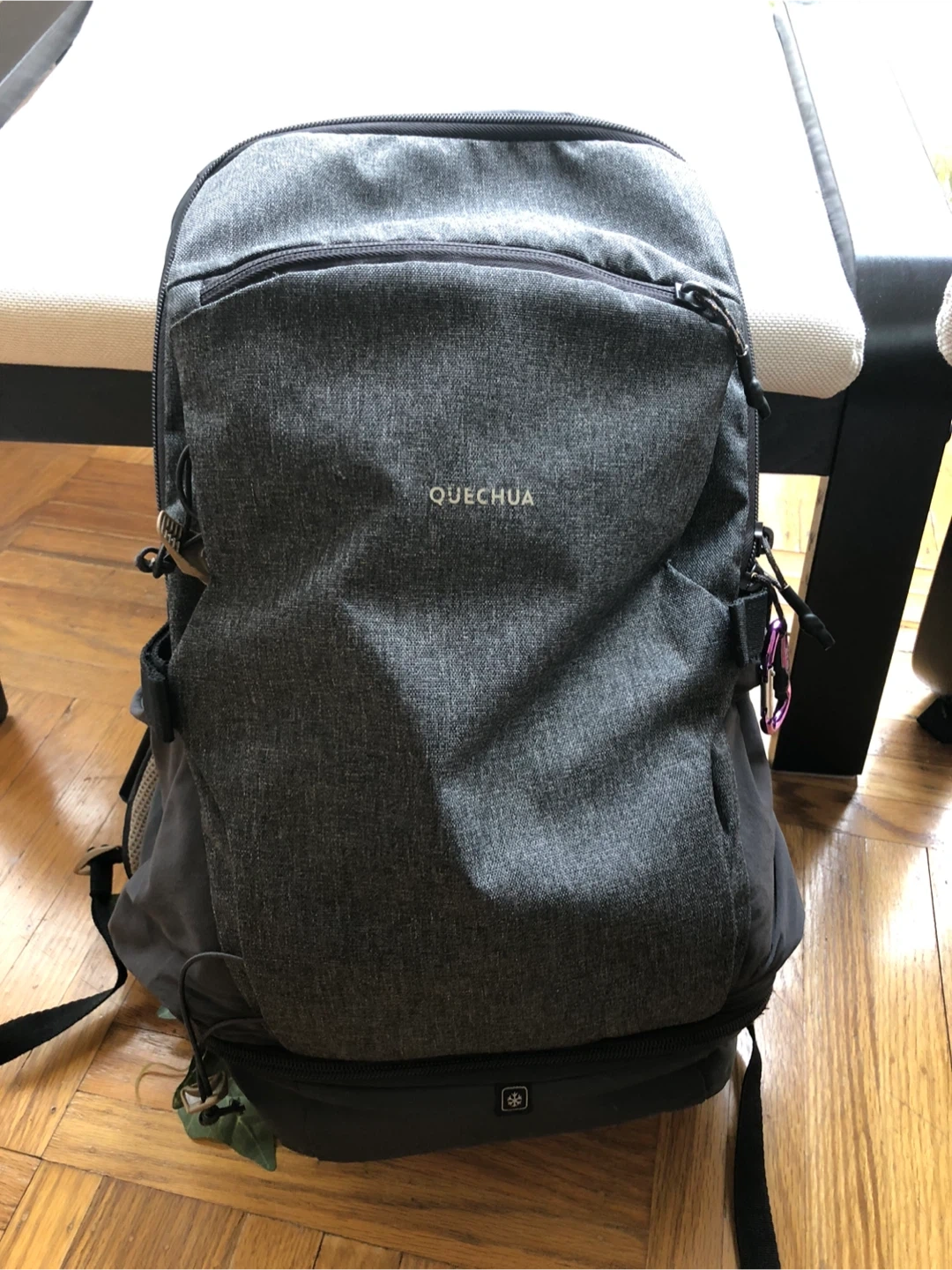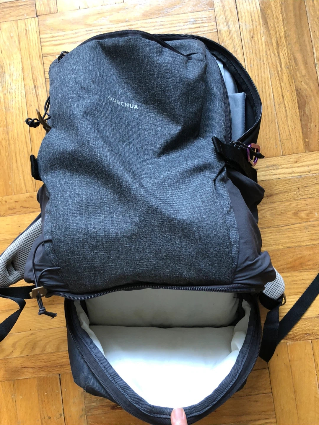 Grey Quechua backpack with multiple compartments, at the bottom has a cooler compartment for your cold drinks after the hike! It's made of durable fabric. Great for everyday use or short trips!