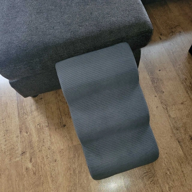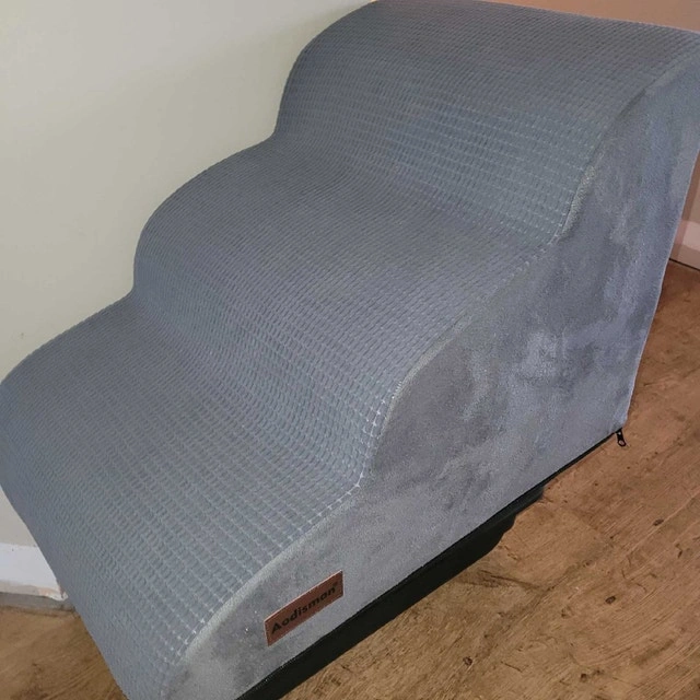 Give your furry friend a helping hand with these Aodisman dog stairs! These convenient stairs are designed to assist small or elderly dogs in reaching sofas, beds, or chairs with ease. As shown in the pictures, the stairs are in used condition but have been well-maintained. They feature a soft, plush covering for added comfort and a sturdy construction for stability. Specifications: Brand: Aodisman, Type: Dog Stairs, Colour: Gray, Number of Steps: 3, Features: Lightweight and portable. These stairs are ready to step into your pup's life! Can be used by Cats too! Dimensions: 2x1.5x1.5ft. Cash preferred