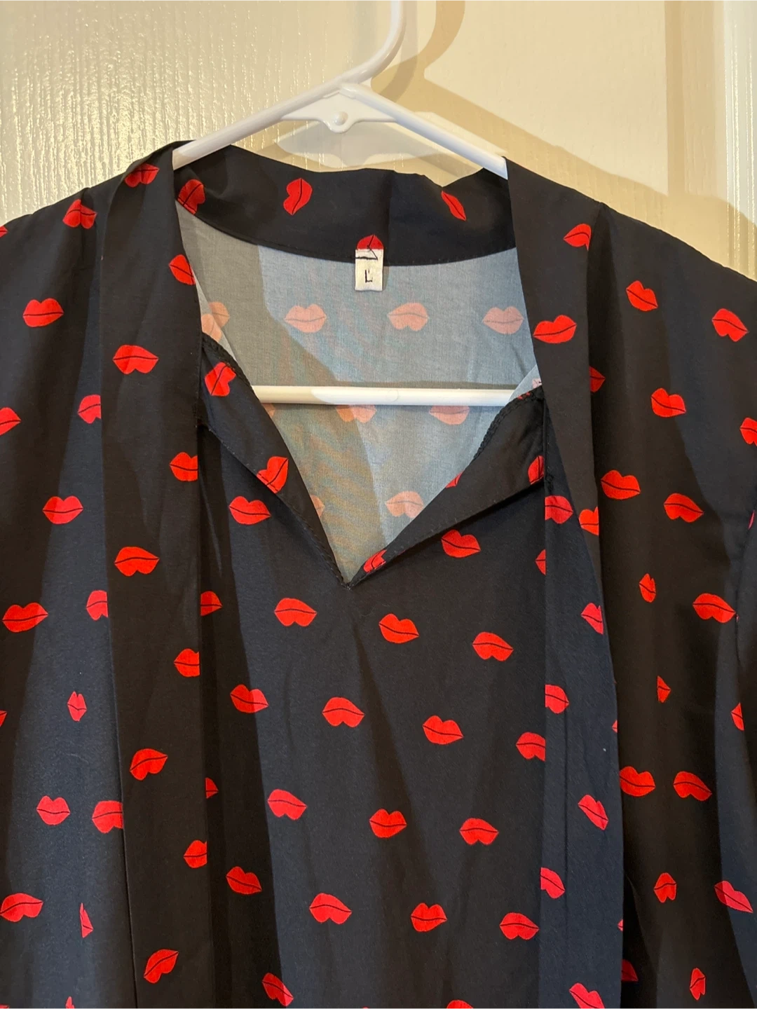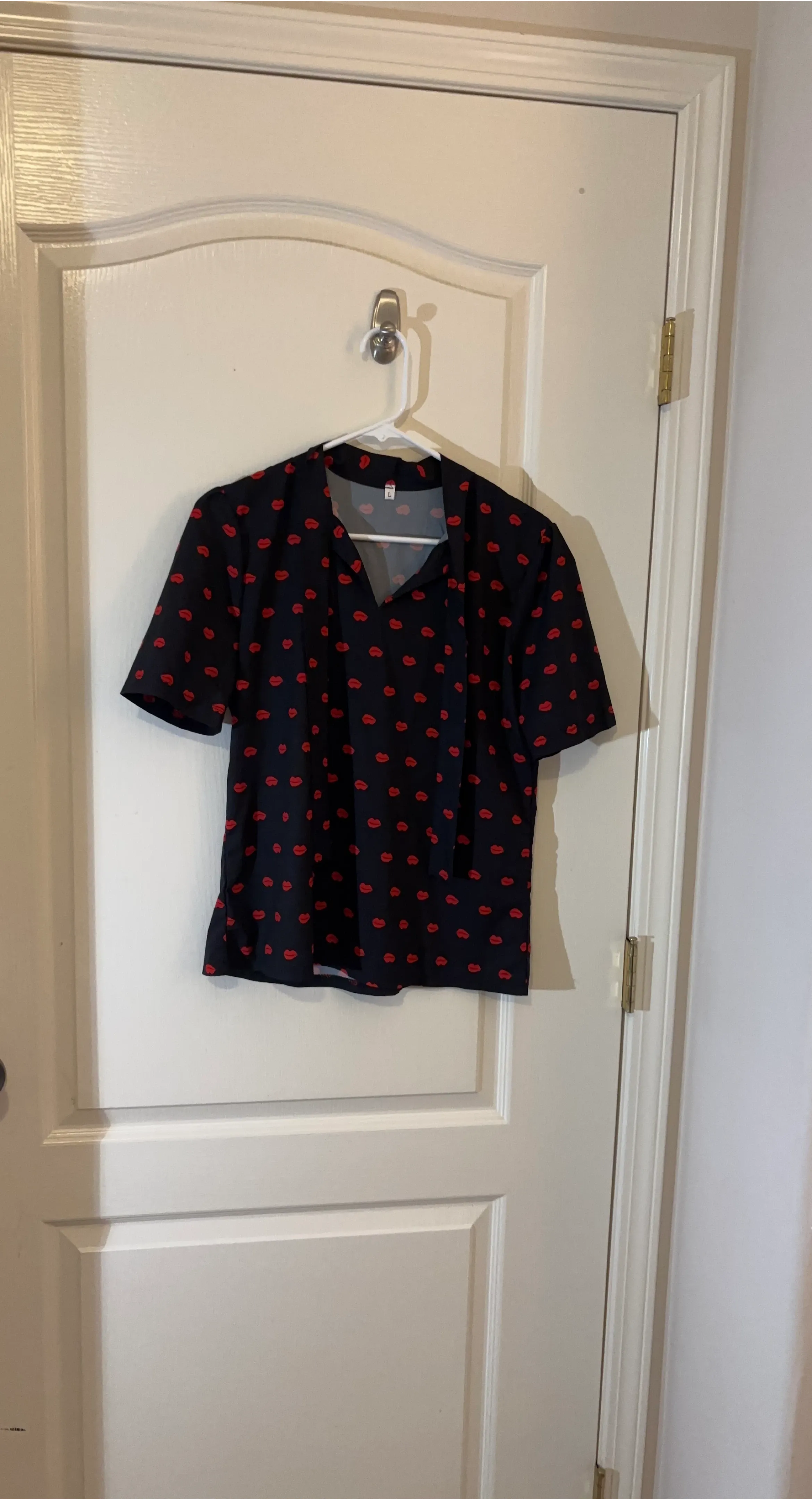 Black short-sleeved blouse with a fun red lips print all over. It has a v-neckline and a tie detail at the neck. Size is L. It's made from a lightweight fabric, perfect for warmer weather! For Valentine’s Day!