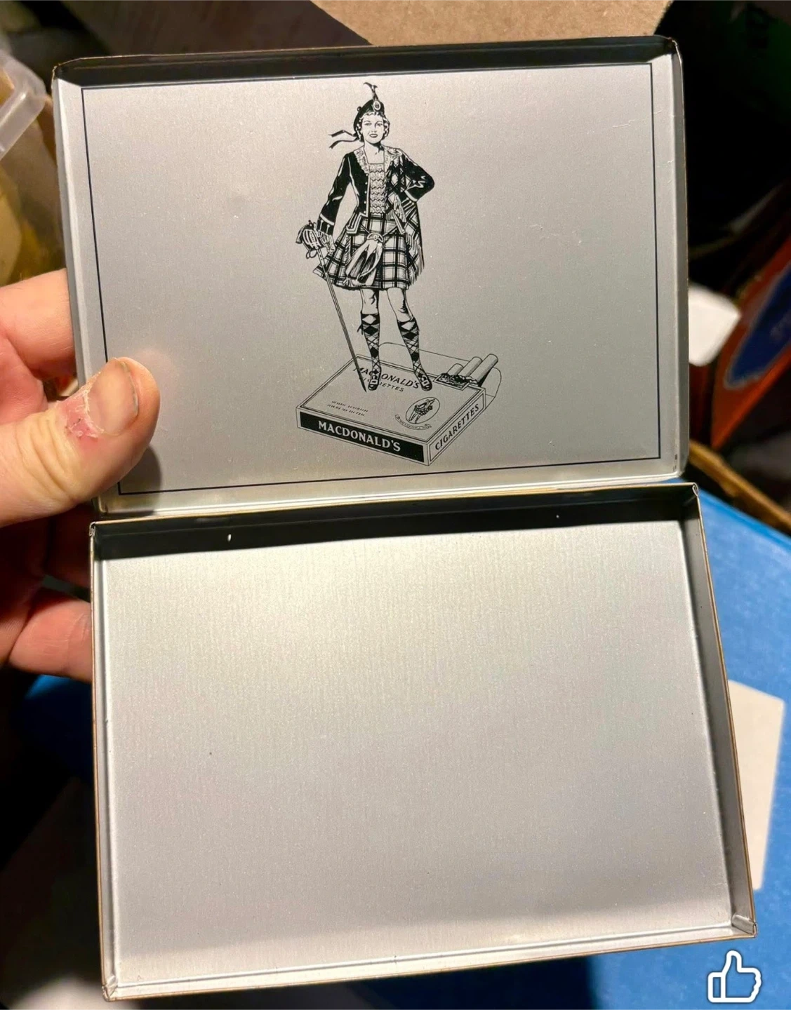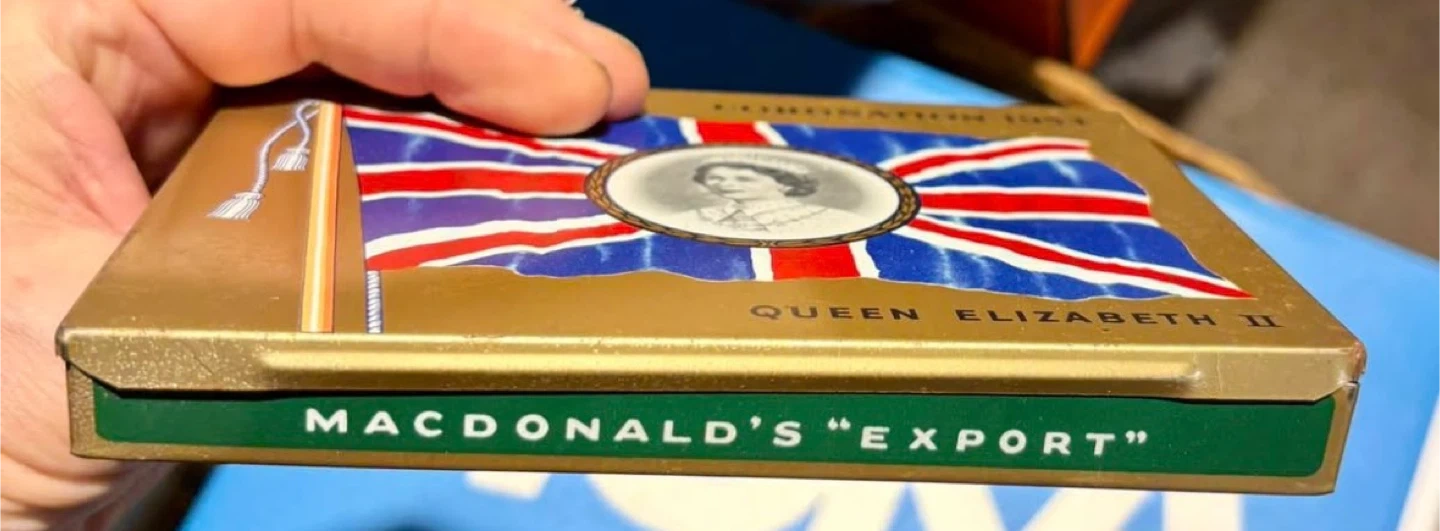 This is a vintage Macdonald's Export cigarette tin commemorating Queen Elizabeth II's Coronation in 1953. It features a Union Jack design with a portrait of the Queen. The tin also has an internal illustration of a Scottish woman and Macdonald's cigarettes.