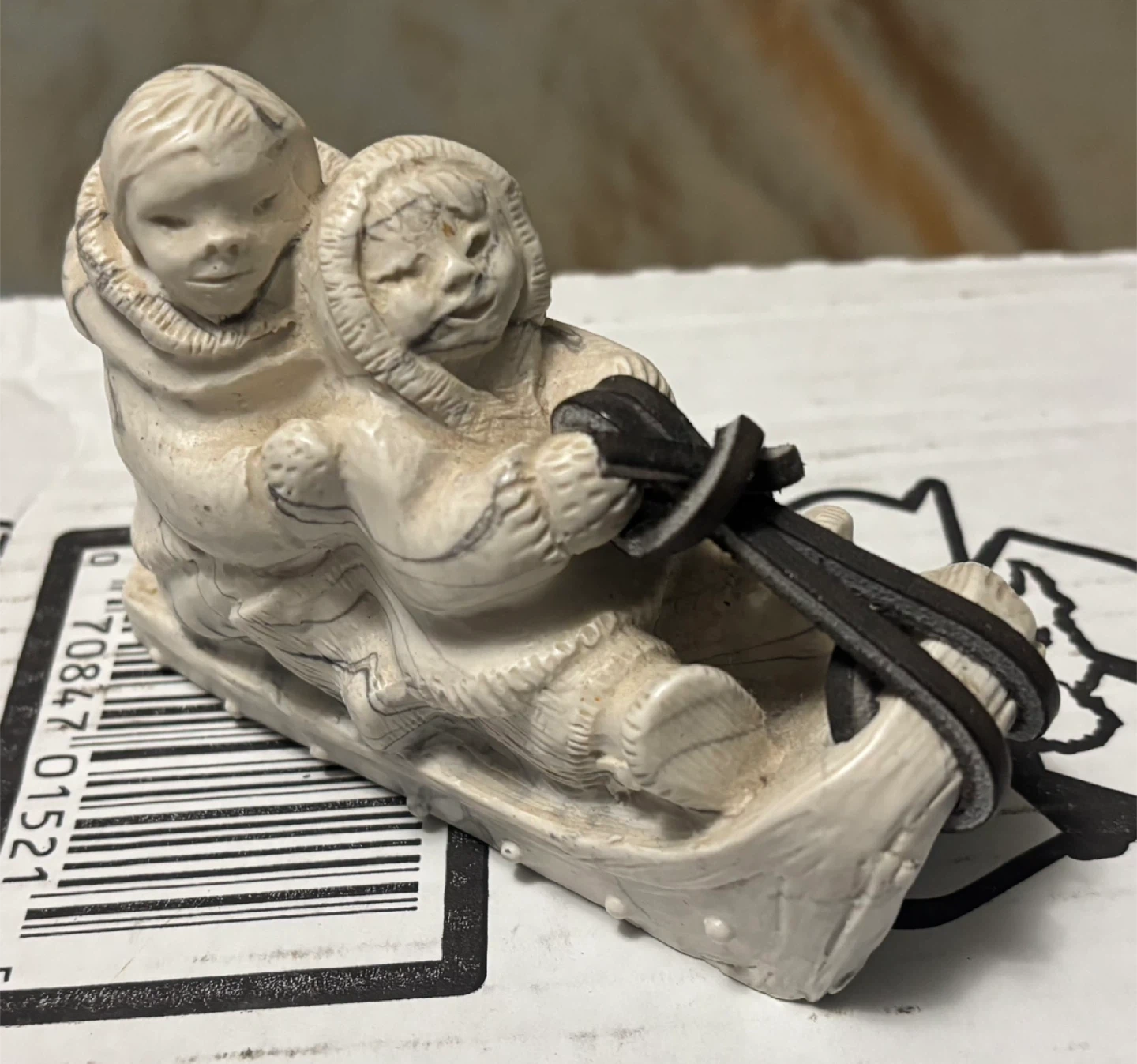Collection of four carved stone figurines, featuring an arctic scene with two figures in a sled, another scene with an adult and child, and a raven. These pieces showcase intricate detail and a classic northern art style.