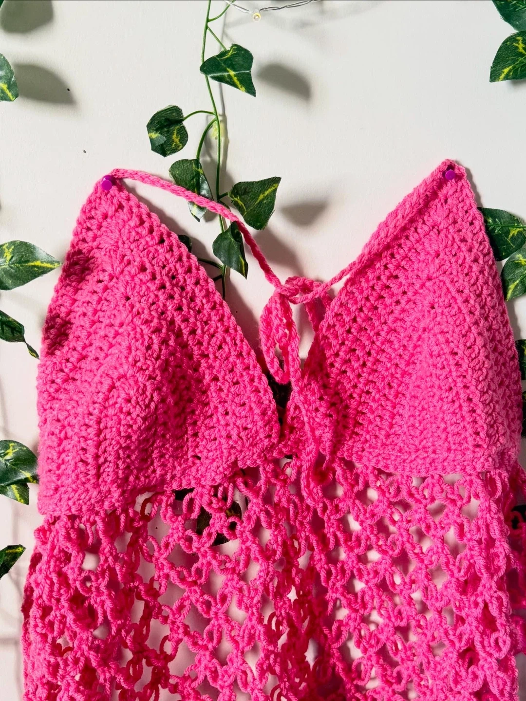 This is a handmade pink crochet halter top. It features a tie-back closure and a lacy, open-knit bottom. It's perfect for summer festivals or beach days!