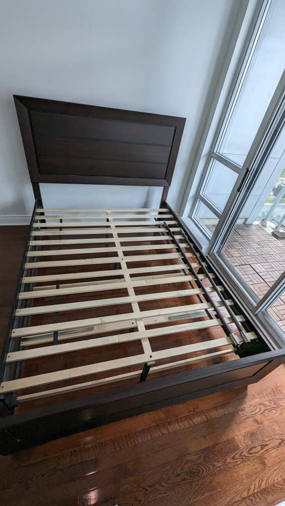 This bed has served us well, however we've moved and the style of the bed no longer complements our new place. The bed is in great condition and comes with 4 drawers which fit quite a bit of clothes which is very convenient. The bed will be disassembled. Pick up only.