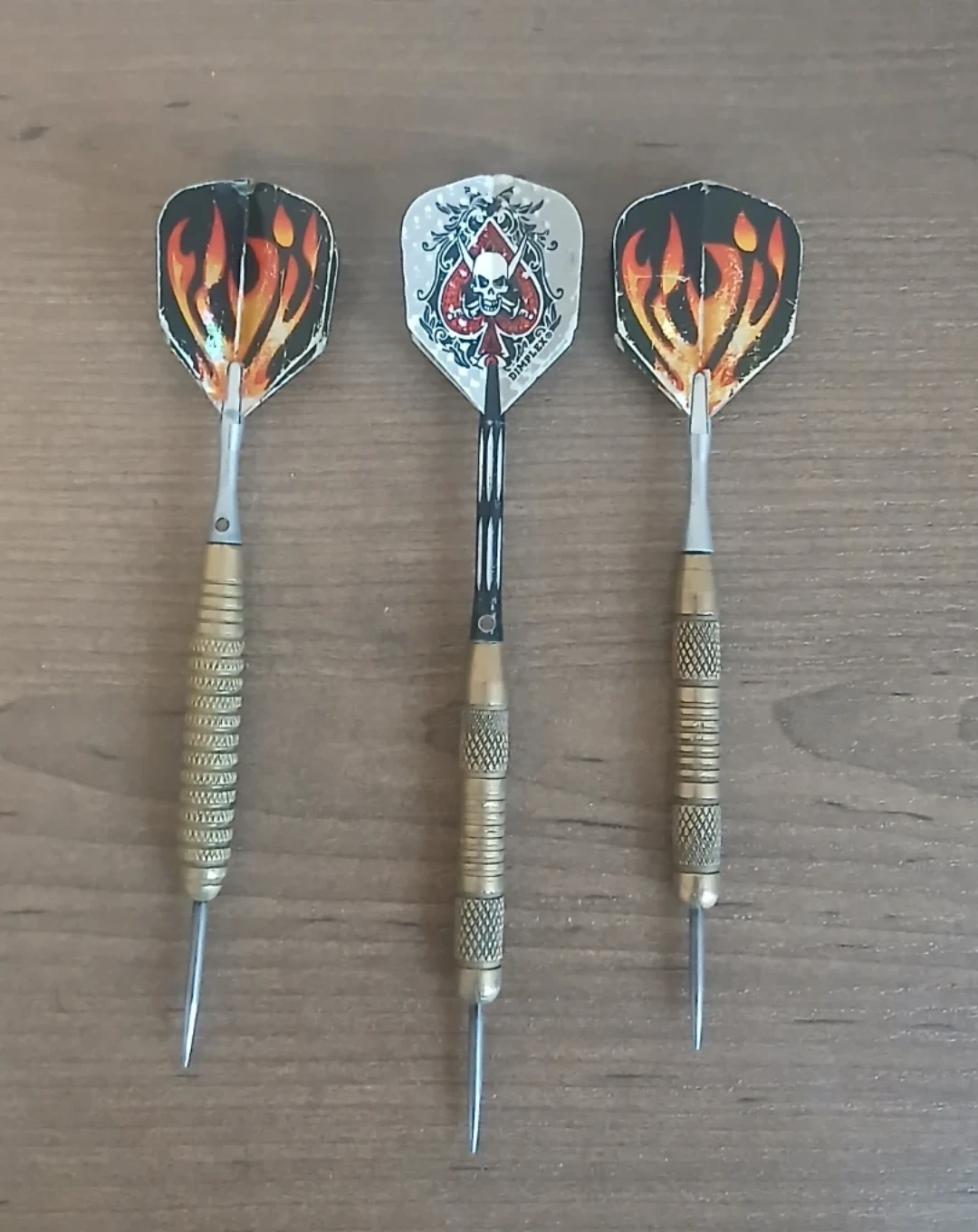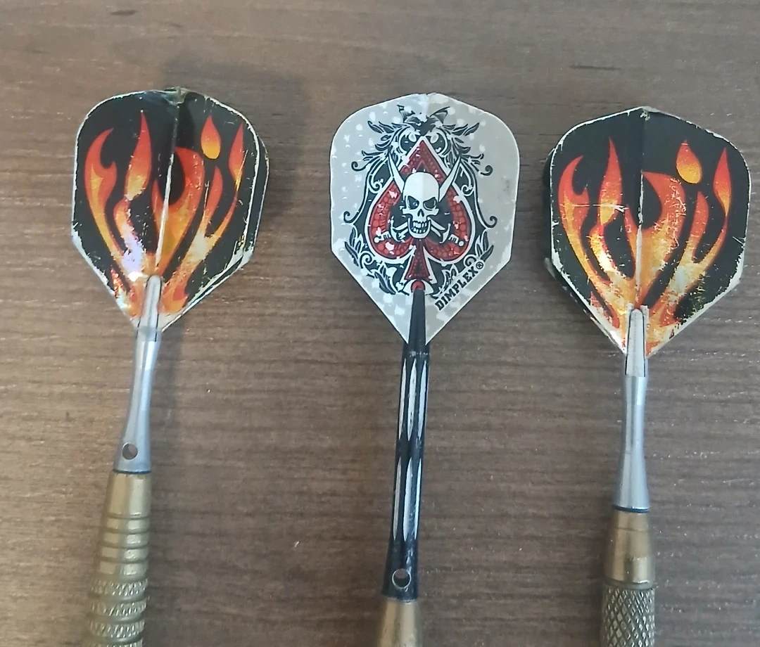 A set of three Dimplex darts, each featuring unique flame or skull and ace of spades designs on the flights. The barrels are gold-toned with a textured grip for stability. These darts are ready for your next game!