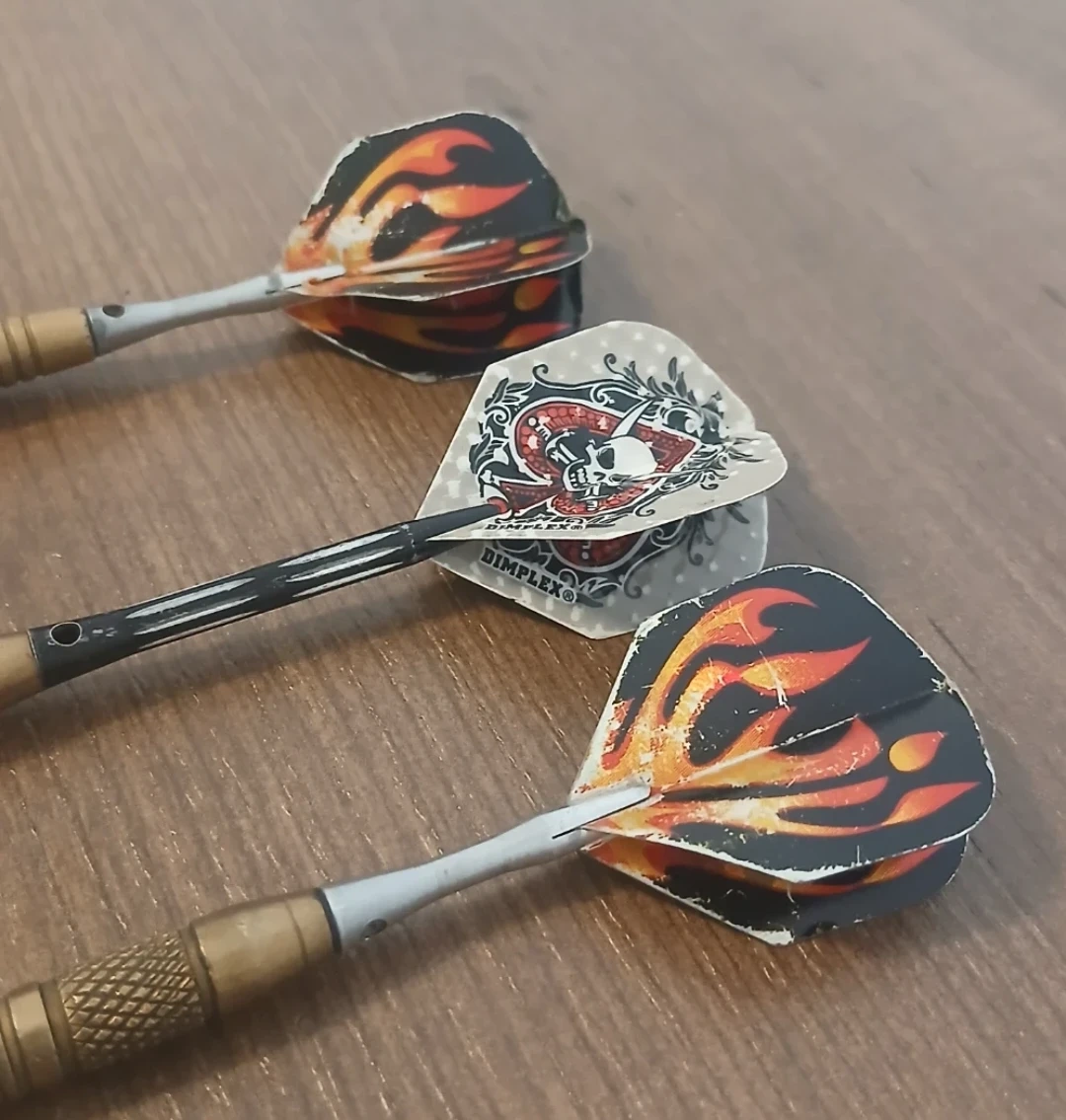 A set of three Dimplex darts, each featuring unique flame or skull and ace of spades designs on the flights. The barrels are gold-toned with a textured grip for stability. These darts are ready for your next game!