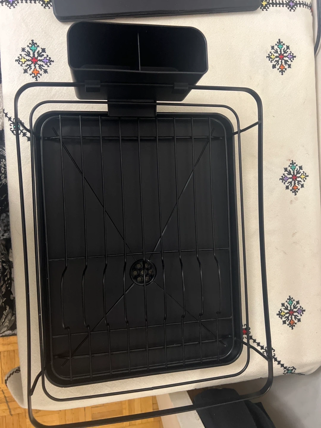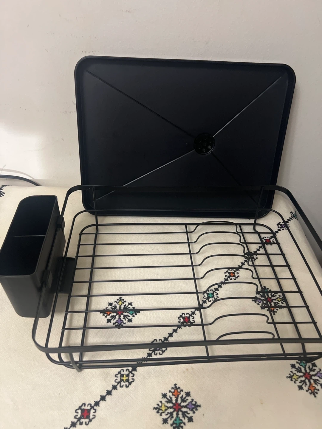 Selling a black dish drying rack! It comes with a tray to catch water and a utensil holder to keep things organized. Great for keeping your kitchen tidy!