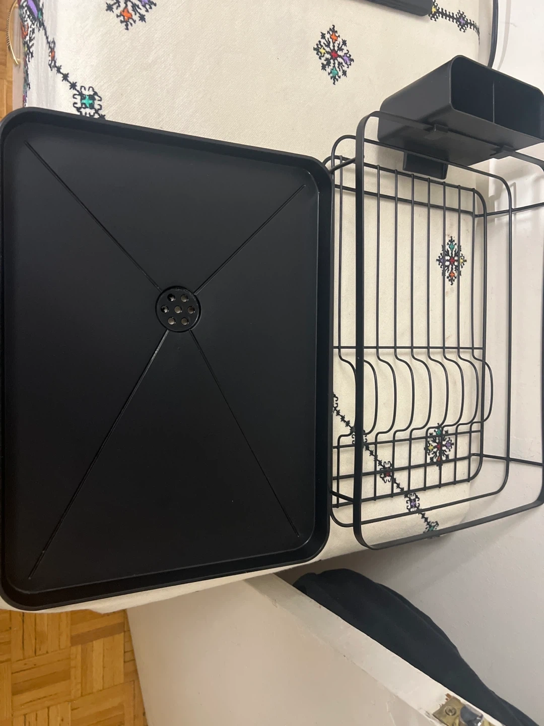 Selling a black dish drying rack! It comes with a tray to catch water and a utensil holder to keep things organized. Great for keeping your kitchen tidy!