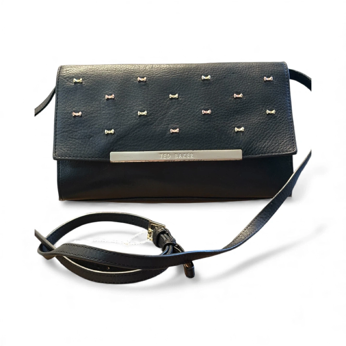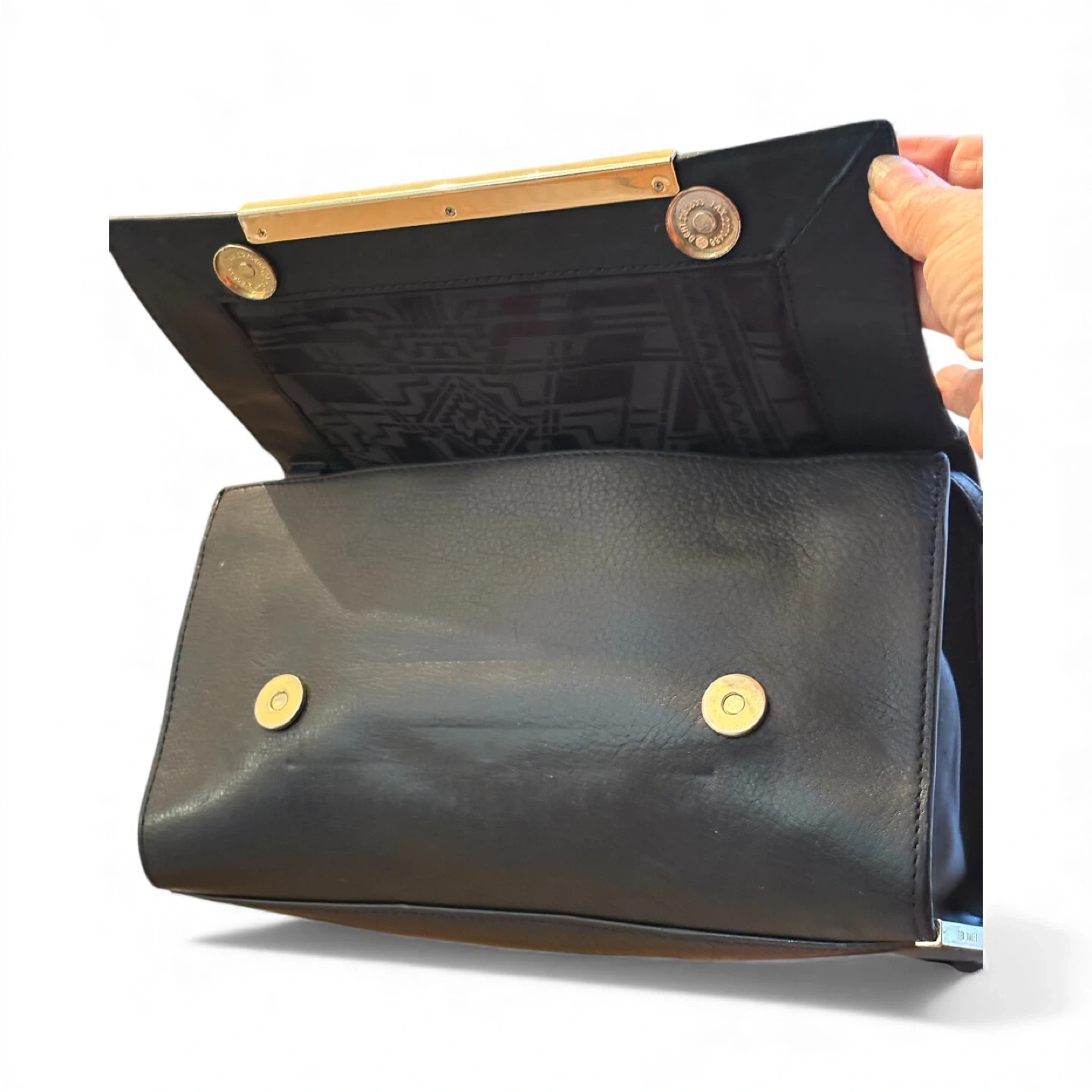 Selling a stylish Ted Baker clutch in black leather. It's in good condition and perfect for evenings out or special occasions. The interior has a cool geometric pattern!