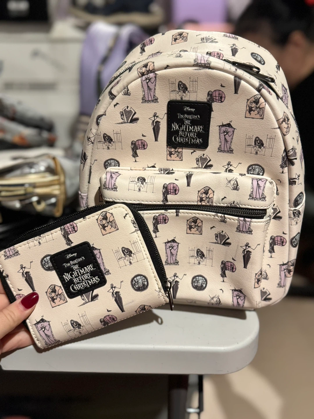 This set includes a backpack and a matching wallet, both featuring a delightful all-over print inspired by Tim Burton's The Nightmare Before Christmas. The print showcases iconic characters and motifs from the beloved film. They're made from a durable faux leather material. This set is perfect for fans of the movie!