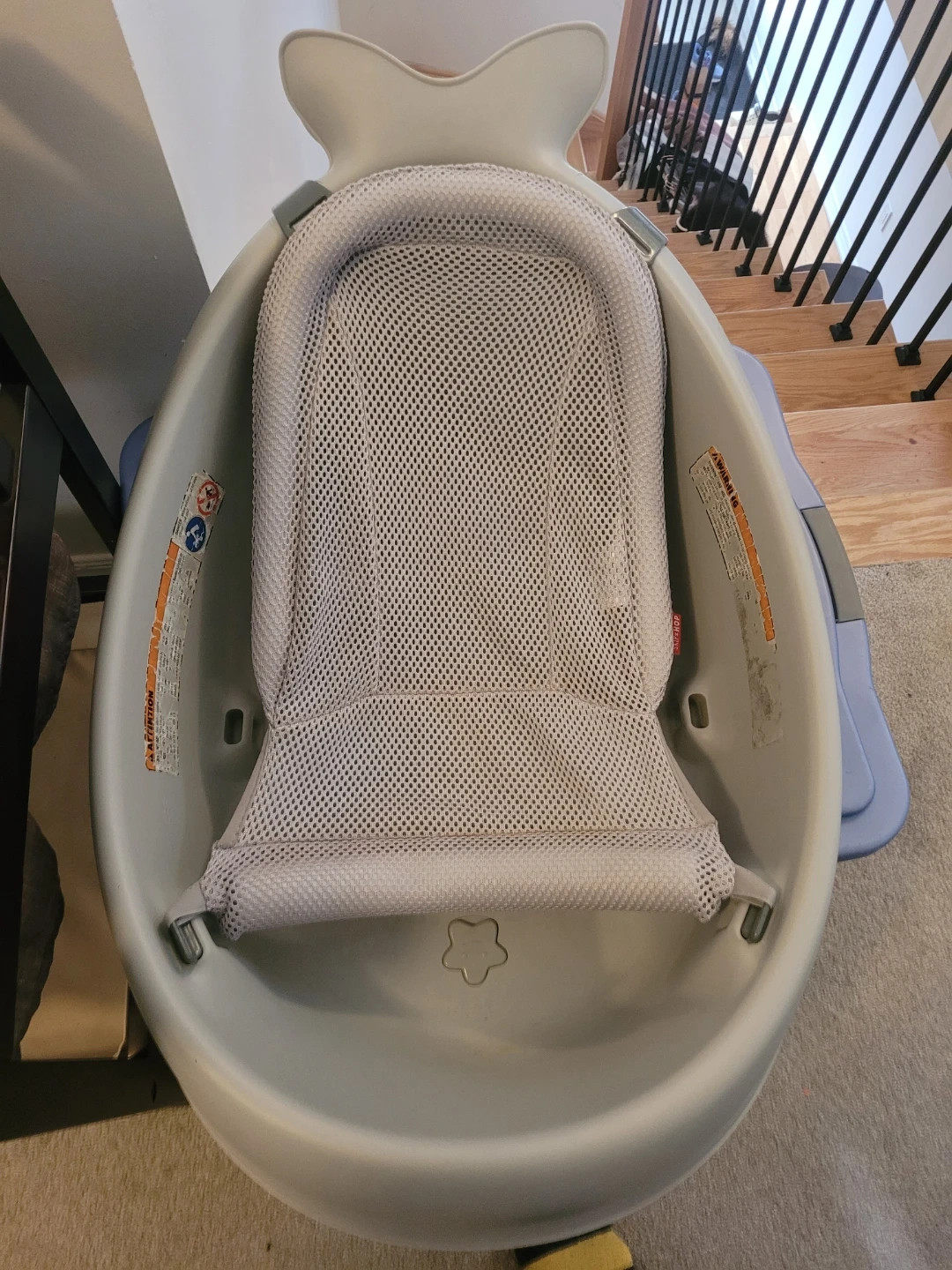 Grey whale-shaped baby bathtub. It comes with a removable newborn insert sling for added support. Mesh sling is quick-drying. Tub has a built-in drain plug and a non-slip surface.