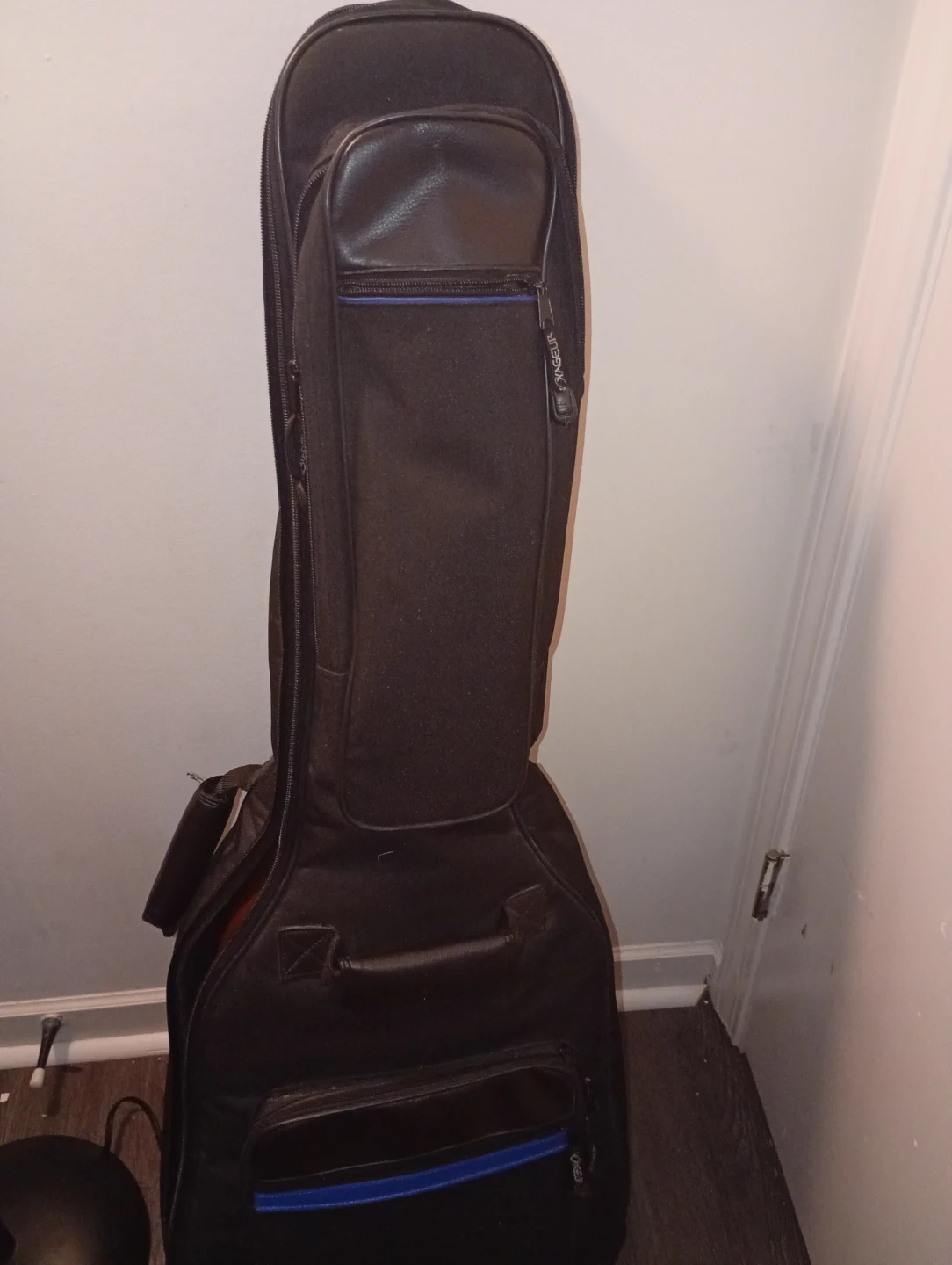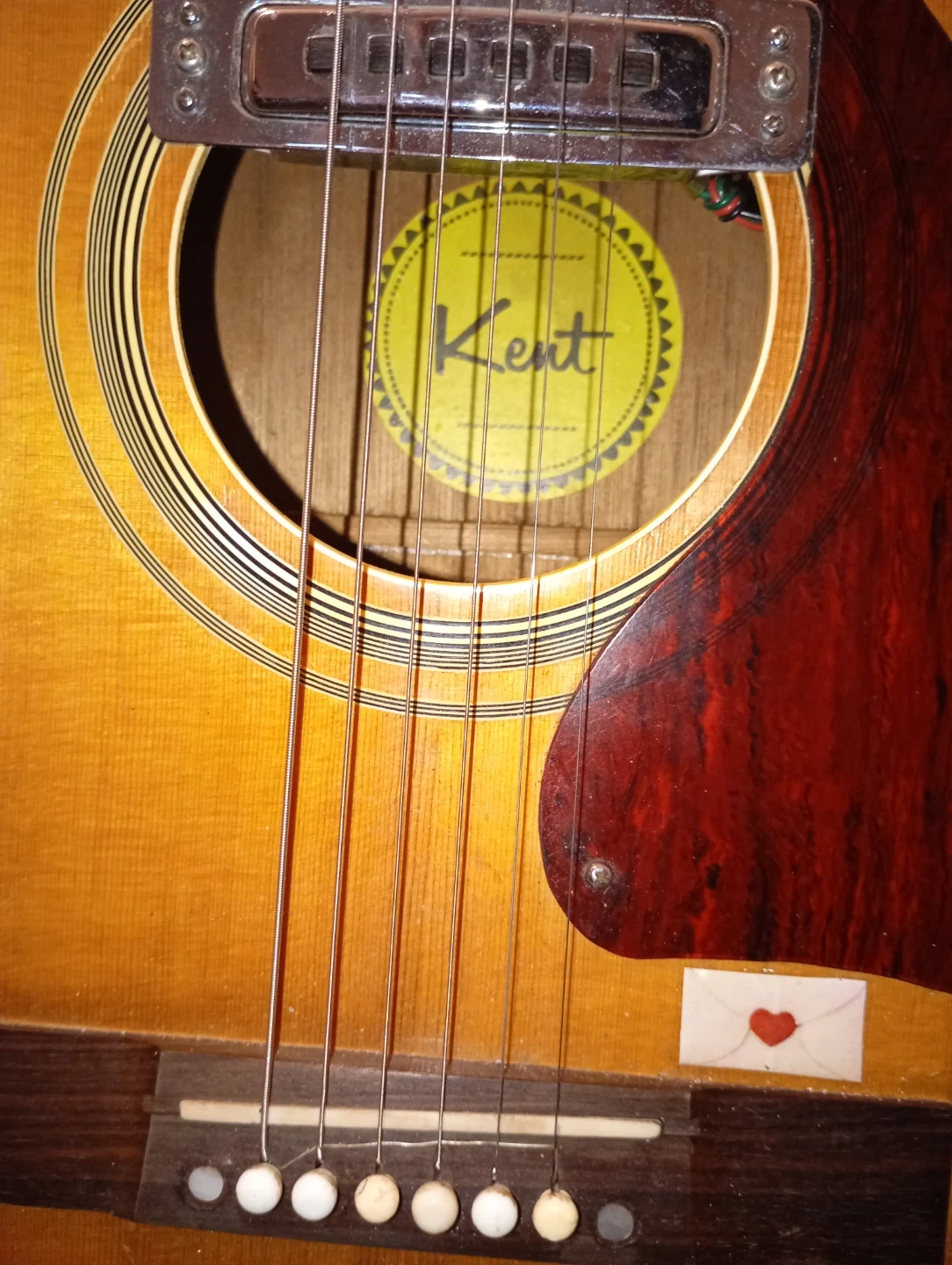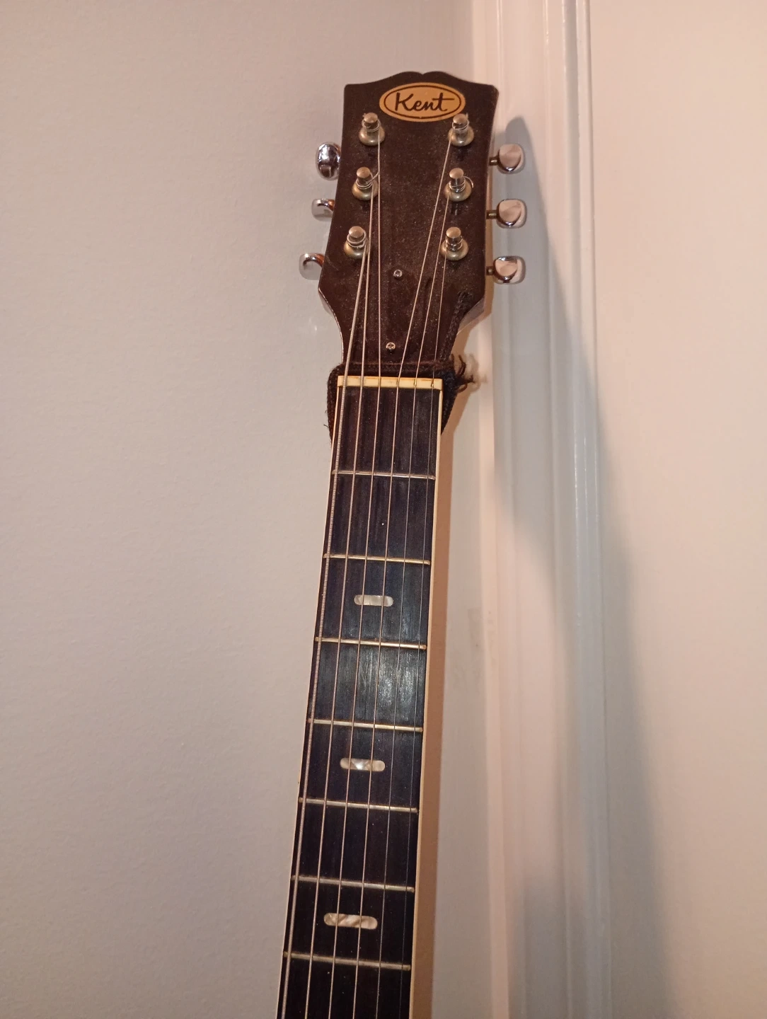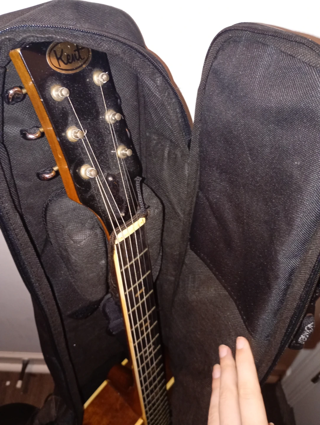 Acoustic guitar from Kent. It comes with a black gig bag for transport and storage. This guitar is ready for a new owner to play it!