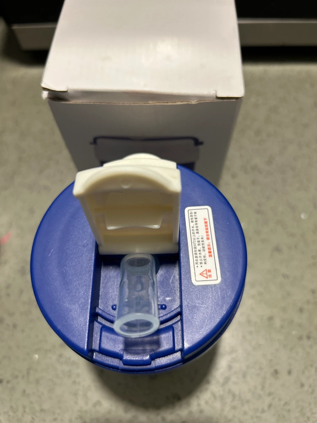 This is a Guegras Pay Rise tumbler, perfect for keeping your drinks handy. It features a blue lid with a flip-up straw mechanism. Includes original box.