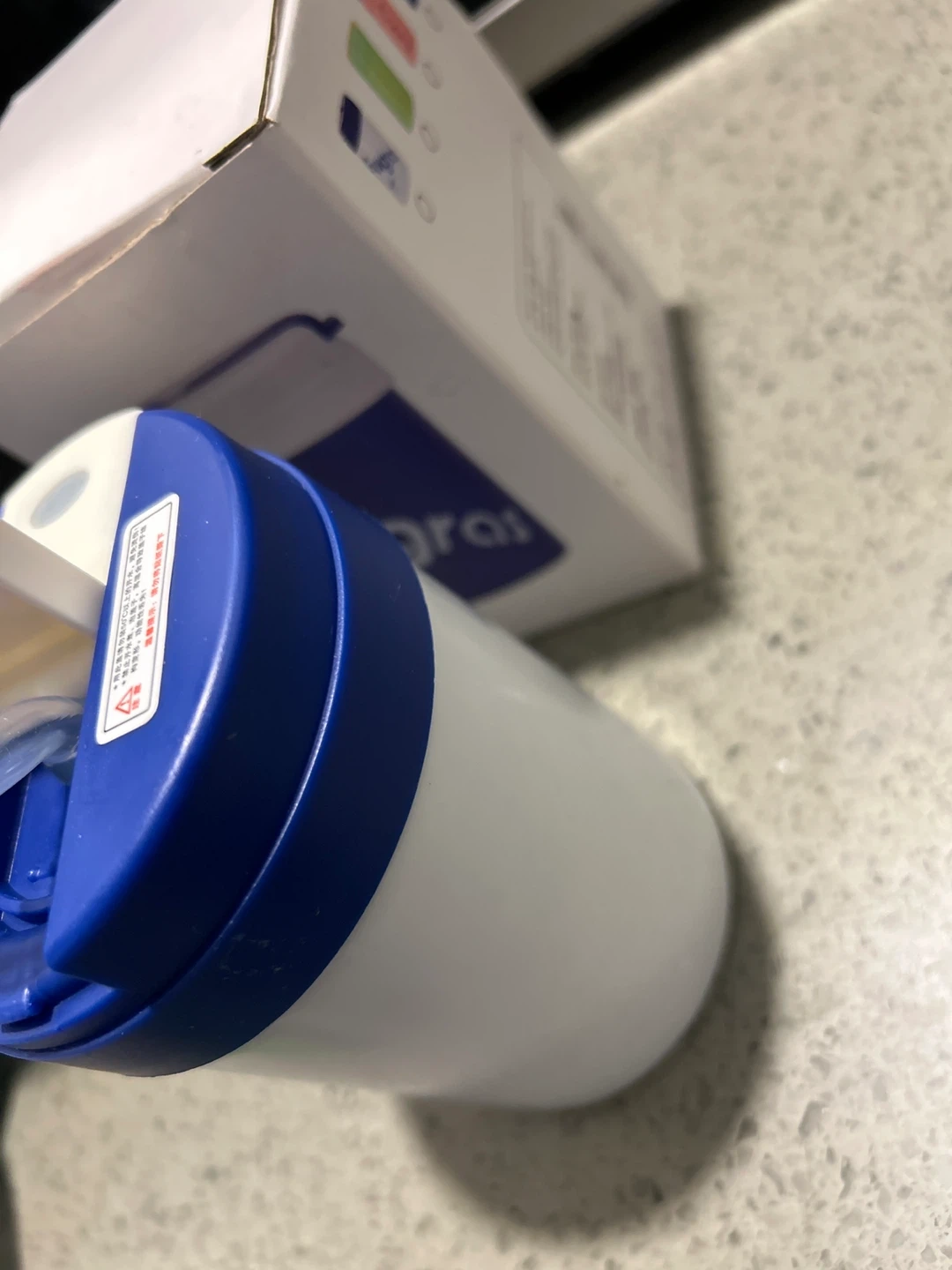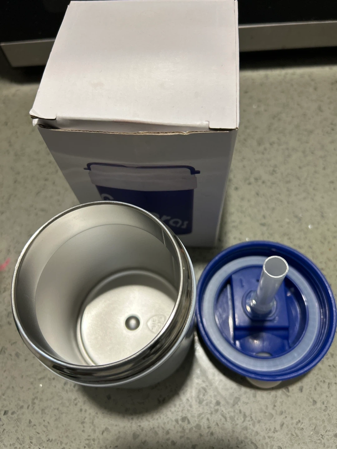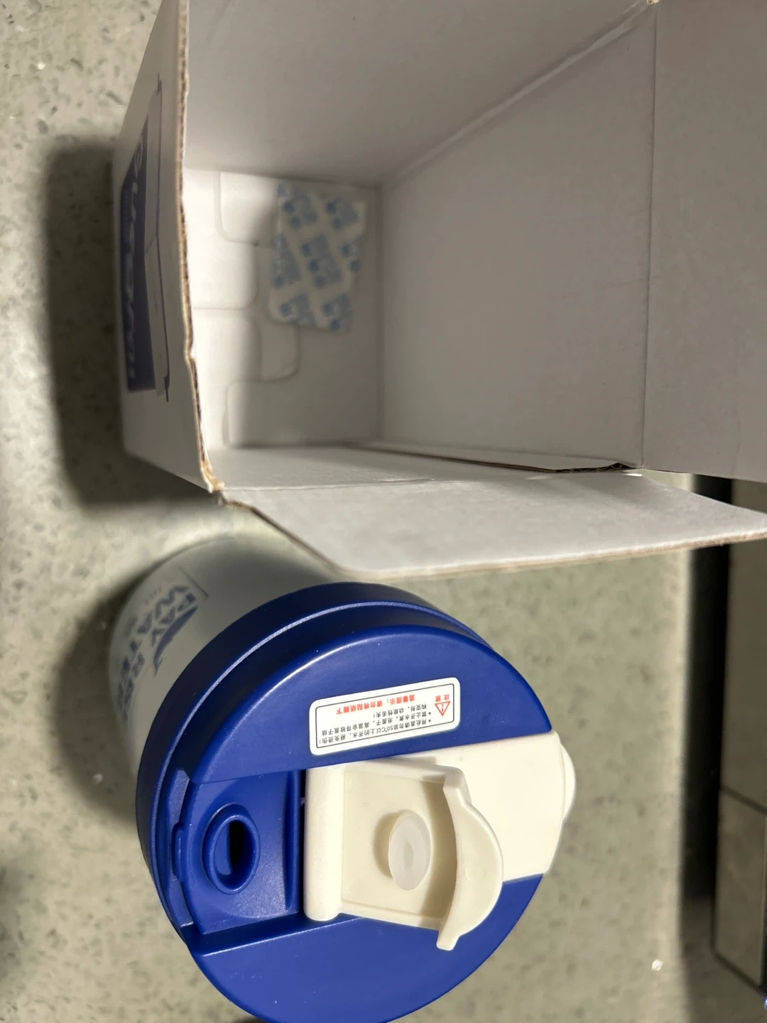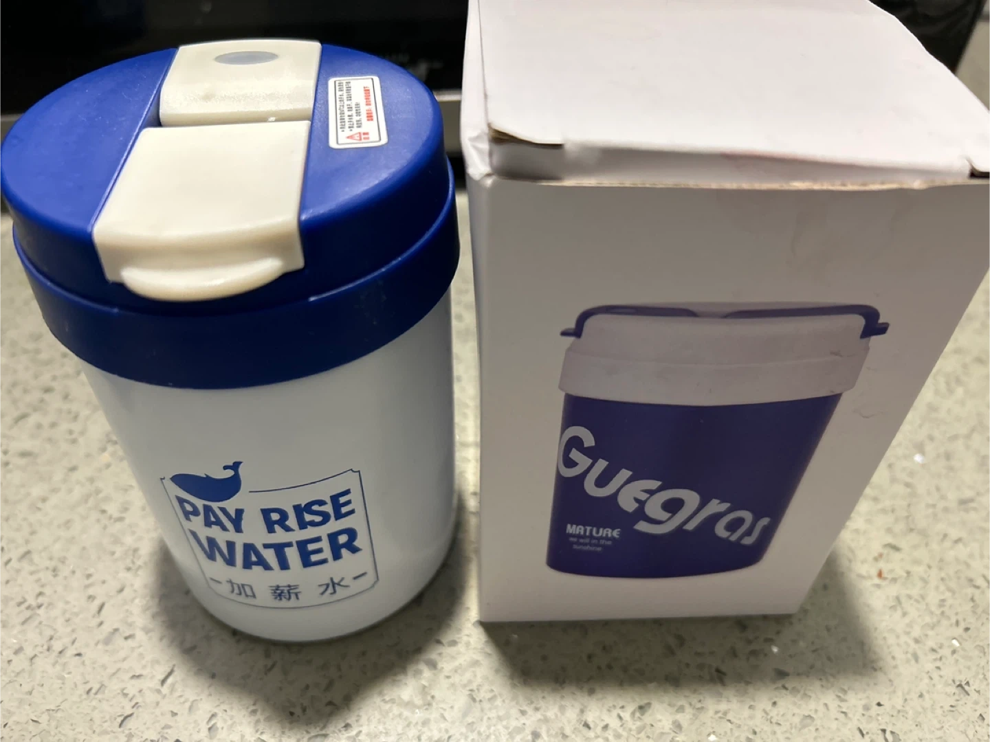 This is a Guegras Pay Rise tumbler, perfect for keeping your drinks handy. It features a blue lid with a flip-up straw mechanism. Includes original box.