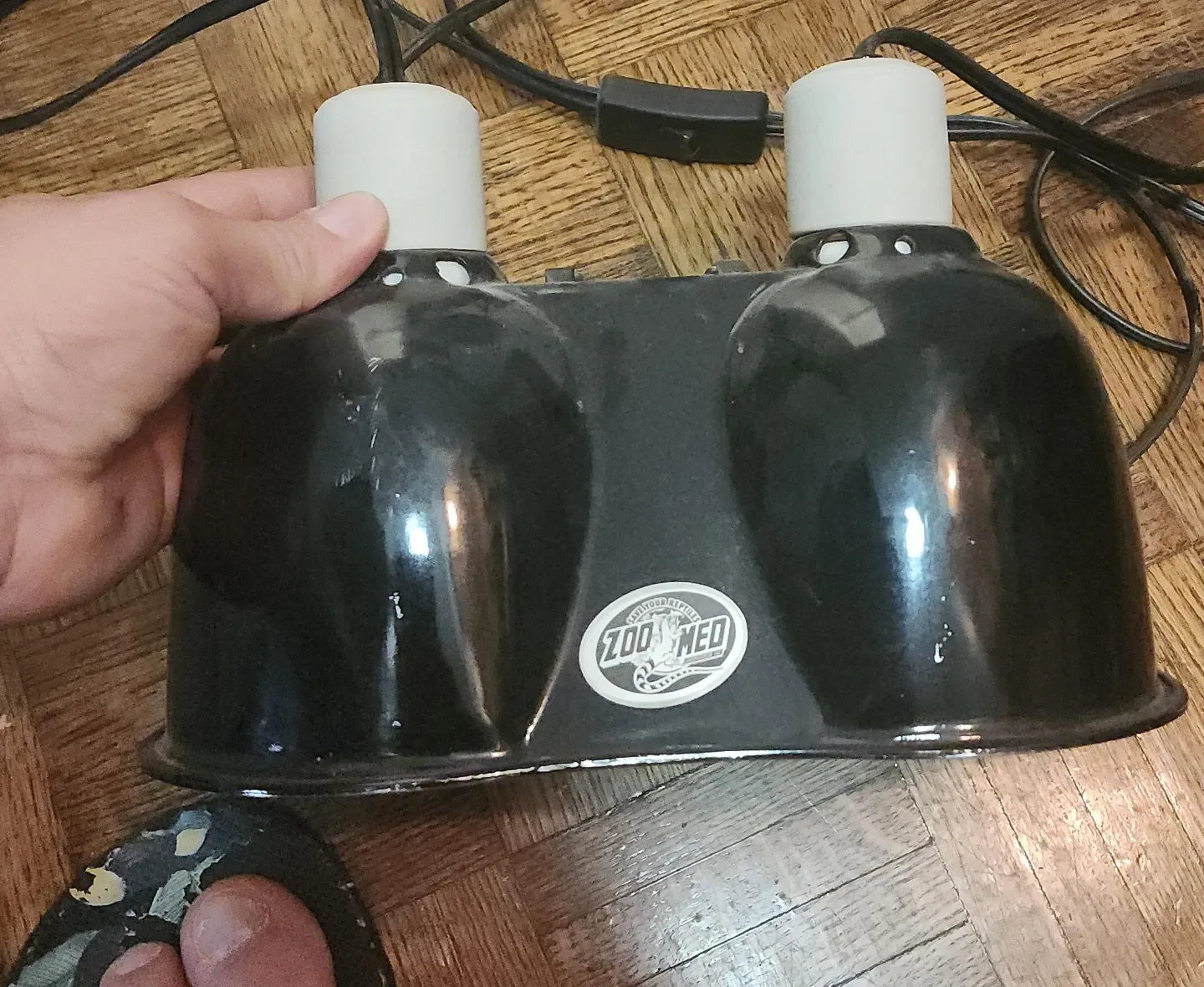 This is a black Zoo Med fixture with two lamp sockets. It's designed for reptile terrariums. The fixture has a power cord with an inline on/off switch.