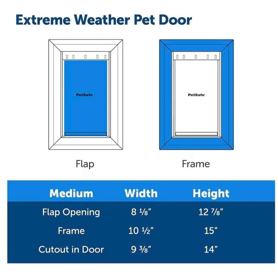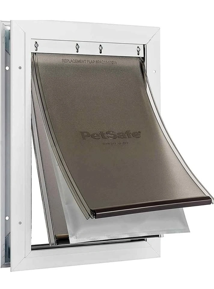 New in the box Pet Door – Size M, White. Brand: PetSafe. Compatible door thickness: 1 1/2" – 2". Features: Energy Efficient: Innovative 3-flap system helps reduce heat and cold air loss. Extra Insulation: Central insulated flap helps maintain indoor temperature. Controlled Access: Snap-on closing panel prevents pets from using the door when needed. Customizable Look: Paintable frame to match your door color. DIY Installation: Fits standard panelled, wood, metal, and PVC doors. Trusted Quality: Designed by a leading global pet brand.
