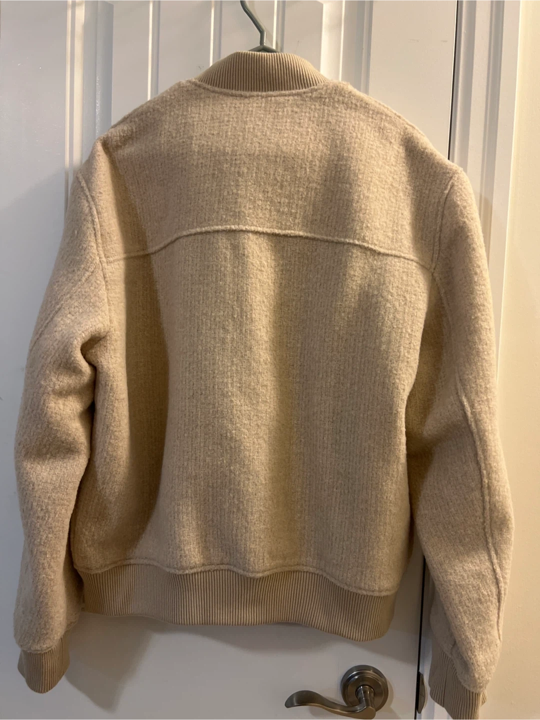 This beige bomber jacket from H&M is a stylish outerwear piece. It's made with a textured fabric and features ribbed cuffs and hem. A great layering option for cooler weather! Never worn