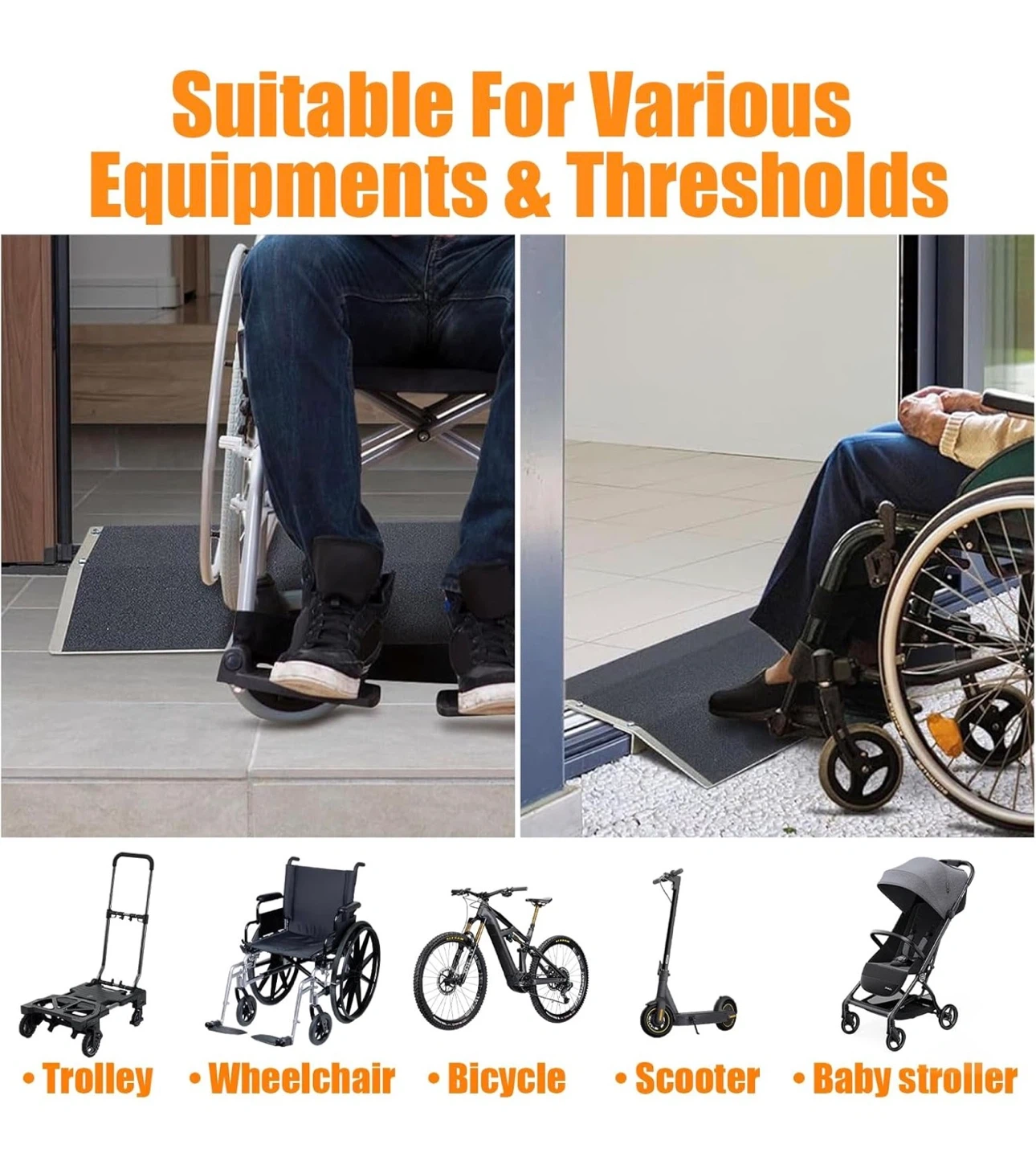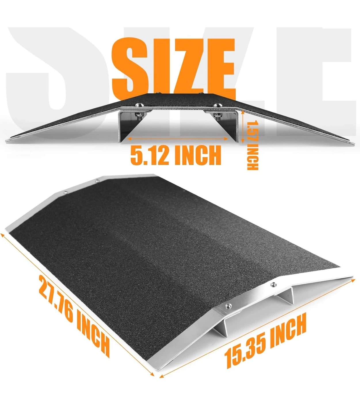 This portable ramp helps overcome thresholds and small steps. It's made of durable aluminum with a non-slip surface for traction. The ramp measures 27.76 inches long, 15.35 inches wide, and has a height of 1.95 inches. It's useful for wheelchairs and scooters to navigate indoor or outdoor transitions easily.