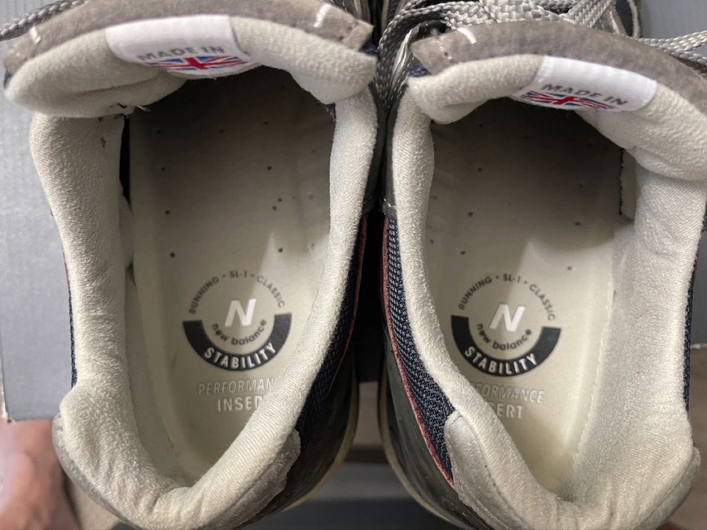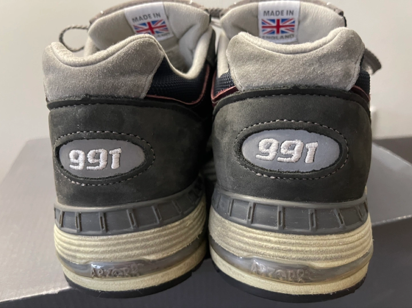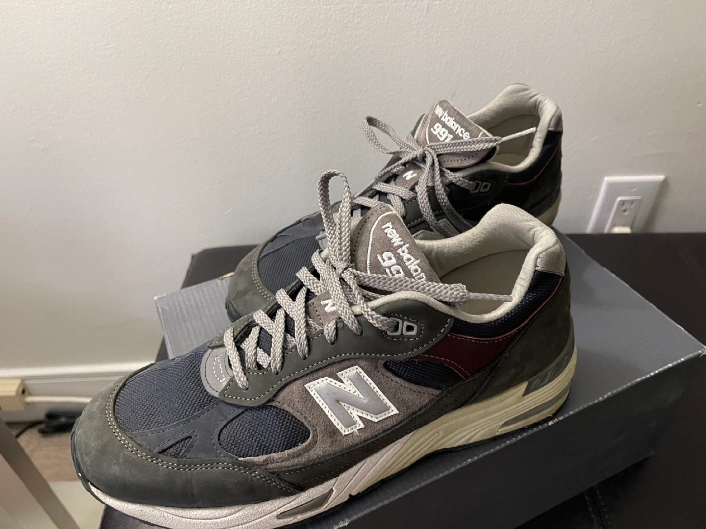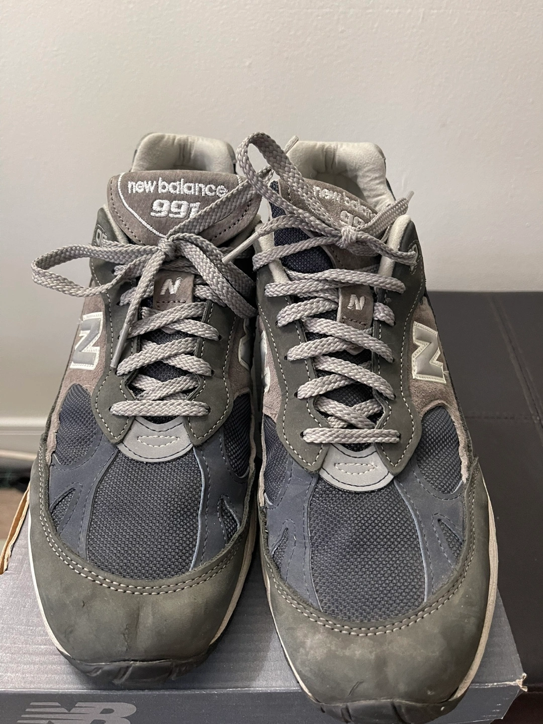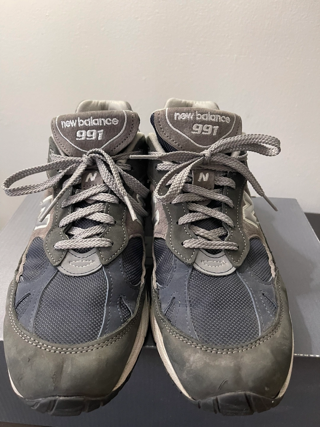 Men's New Balance 991 sneakers. Size 10.5 D. Made in England. Grey and navy colourway. Classic style runners. Comes with original box.