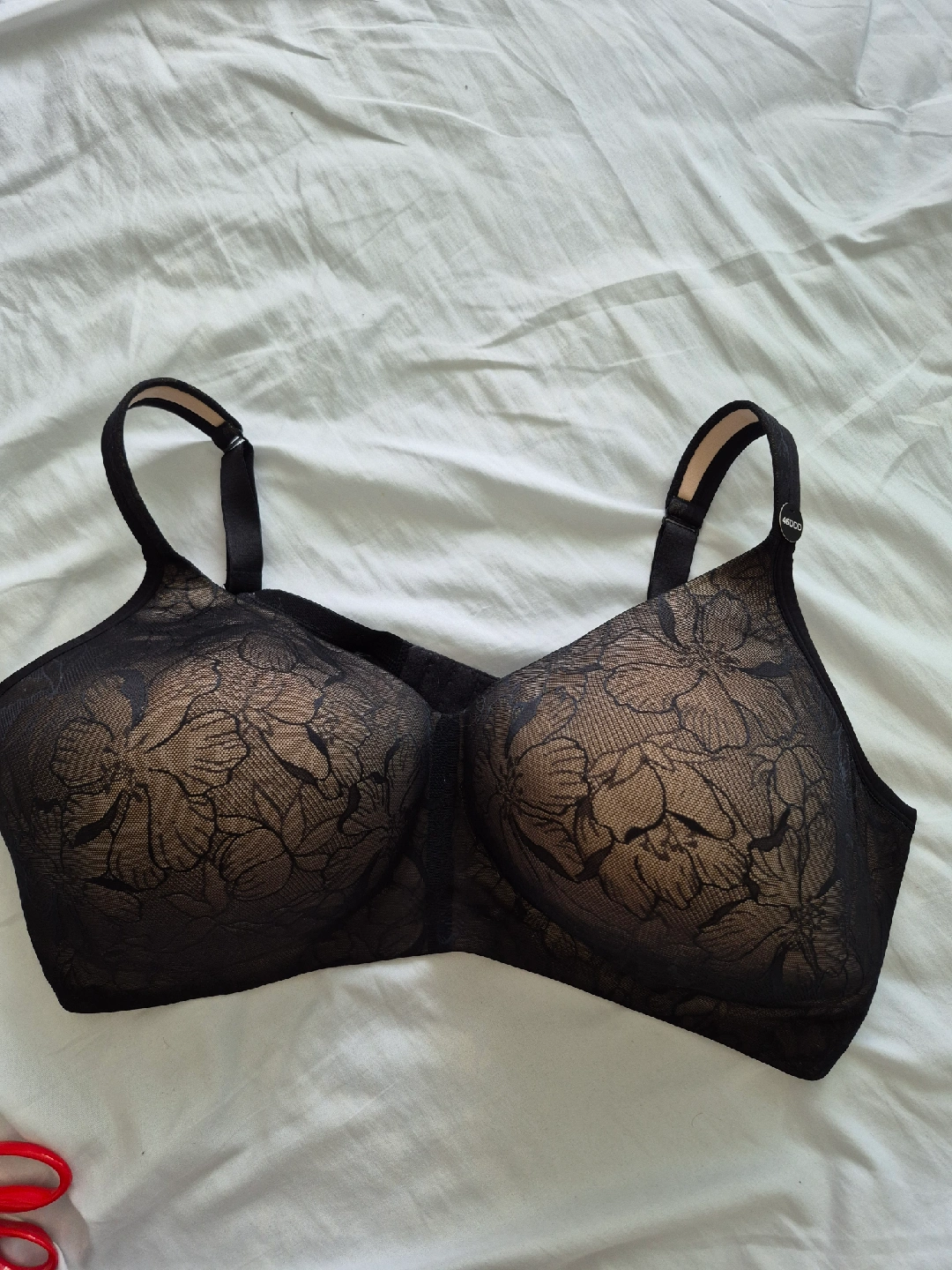 10Selling a Voglio Eva bra in size 46DDD. It features a beautiful black floral lace design. The material composition is 87% polyamide/spandex and the wing is 93% nylon/elastane/spandex