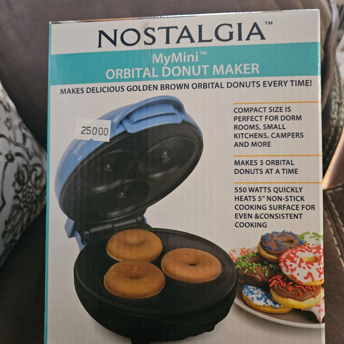This Nostalgia MyMini Orbital Donut Maker makes 3 donuts at a time. It features 550 watts for quick heating and a non-stick cooking surface. Its compact size is perfect for dorm rooms, small kitchens, and campers.