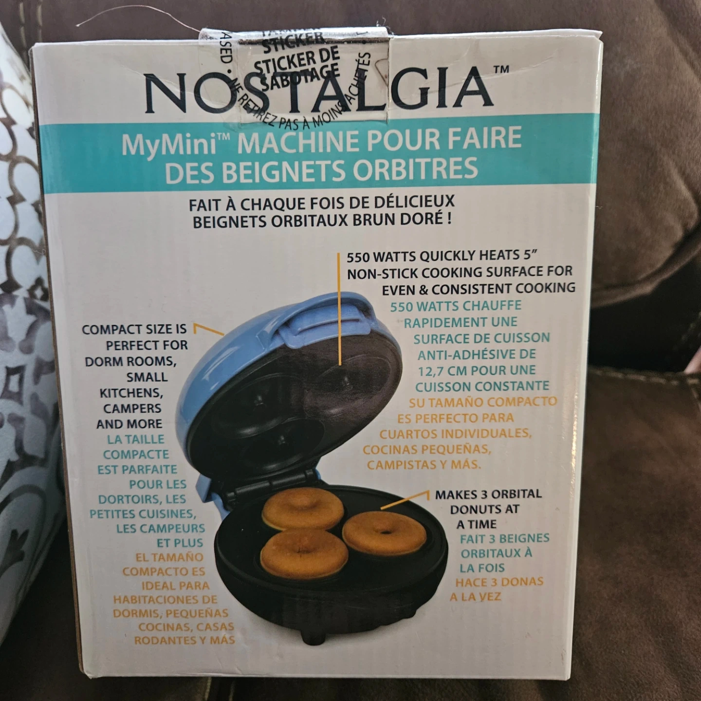 This Nostalgia MyMini Orbital Donut Maker makes 3 donuts at a time. It features 550 watts for quick heating and a non-stick cooking surface. Its compact size is perfect for dorm rooms, small kitchens, and campers.