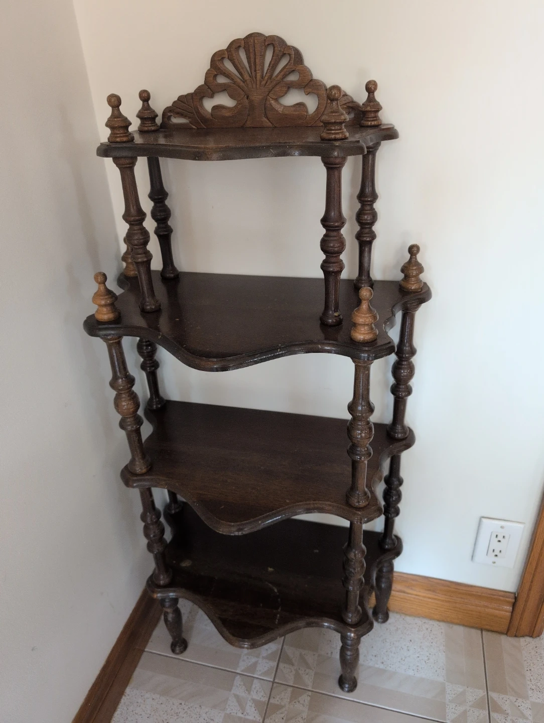 A charming antique wooden shelf unit with four tiers. It features ornate carved detailing at the top and decorative turned spindles throughout. The dark wood finish adds a vintage feel to any space. This shelf unit is perfect for displaying small plants, books, or decorative items.