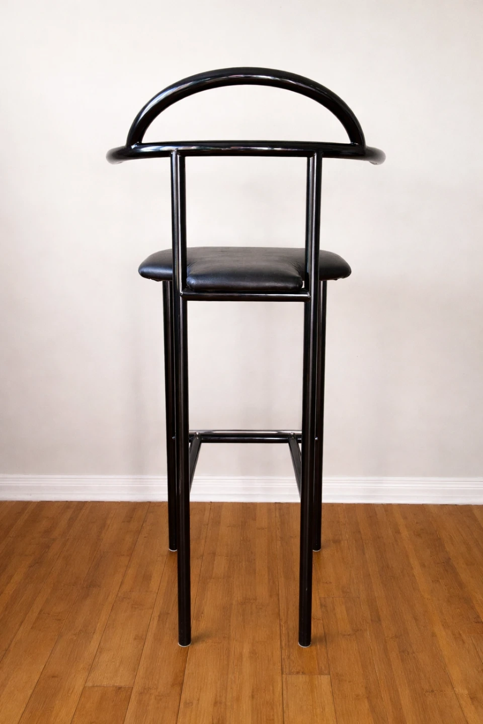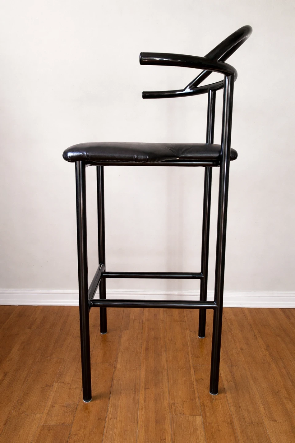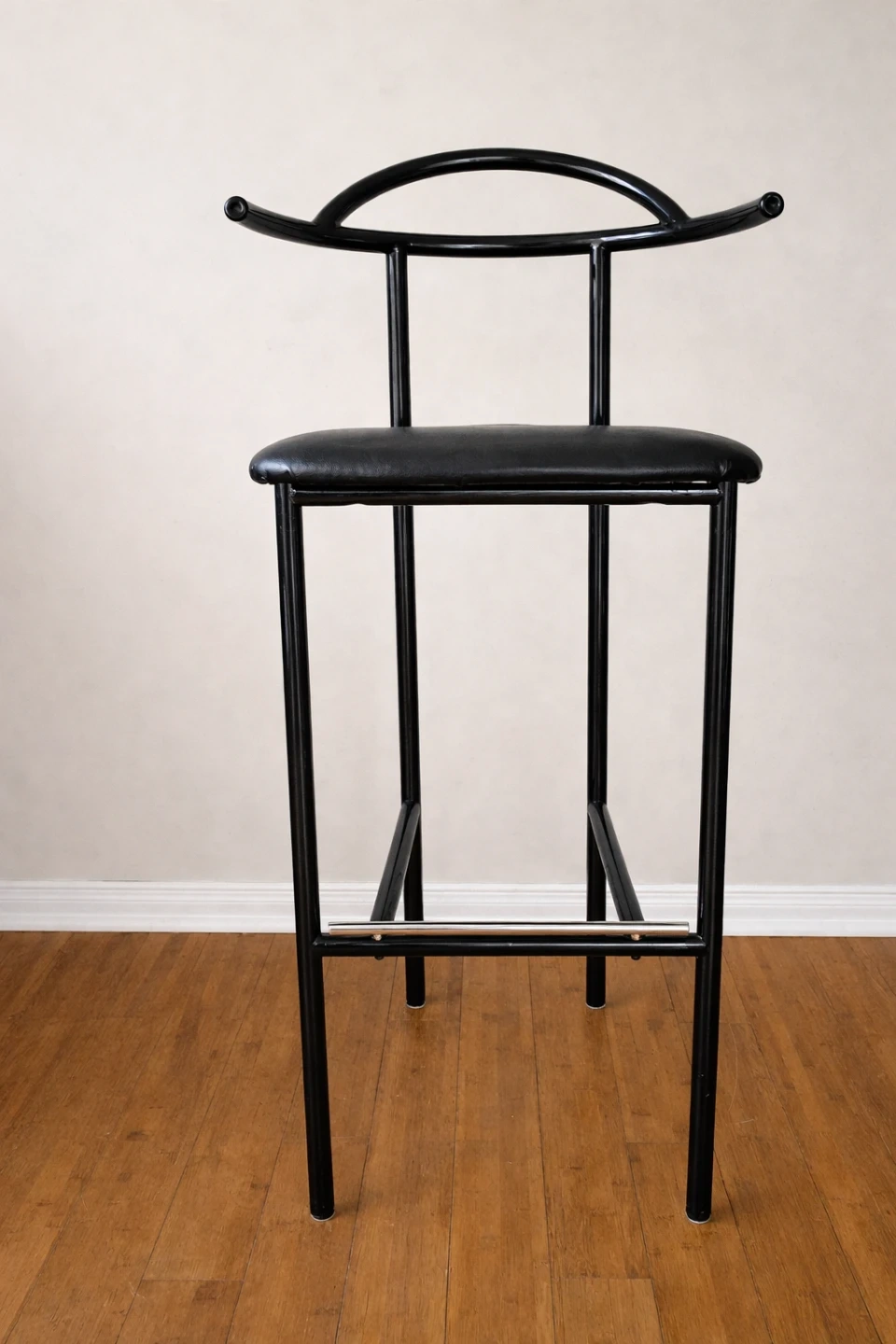 Sleek black bar stool with a cushioned seat and curved arm/back design for extra comfort. Great for kitchen islands or bar setups and easy to match with any space! The sturdy metal frame keeps it stable while still feeling lightweight and easy to move.