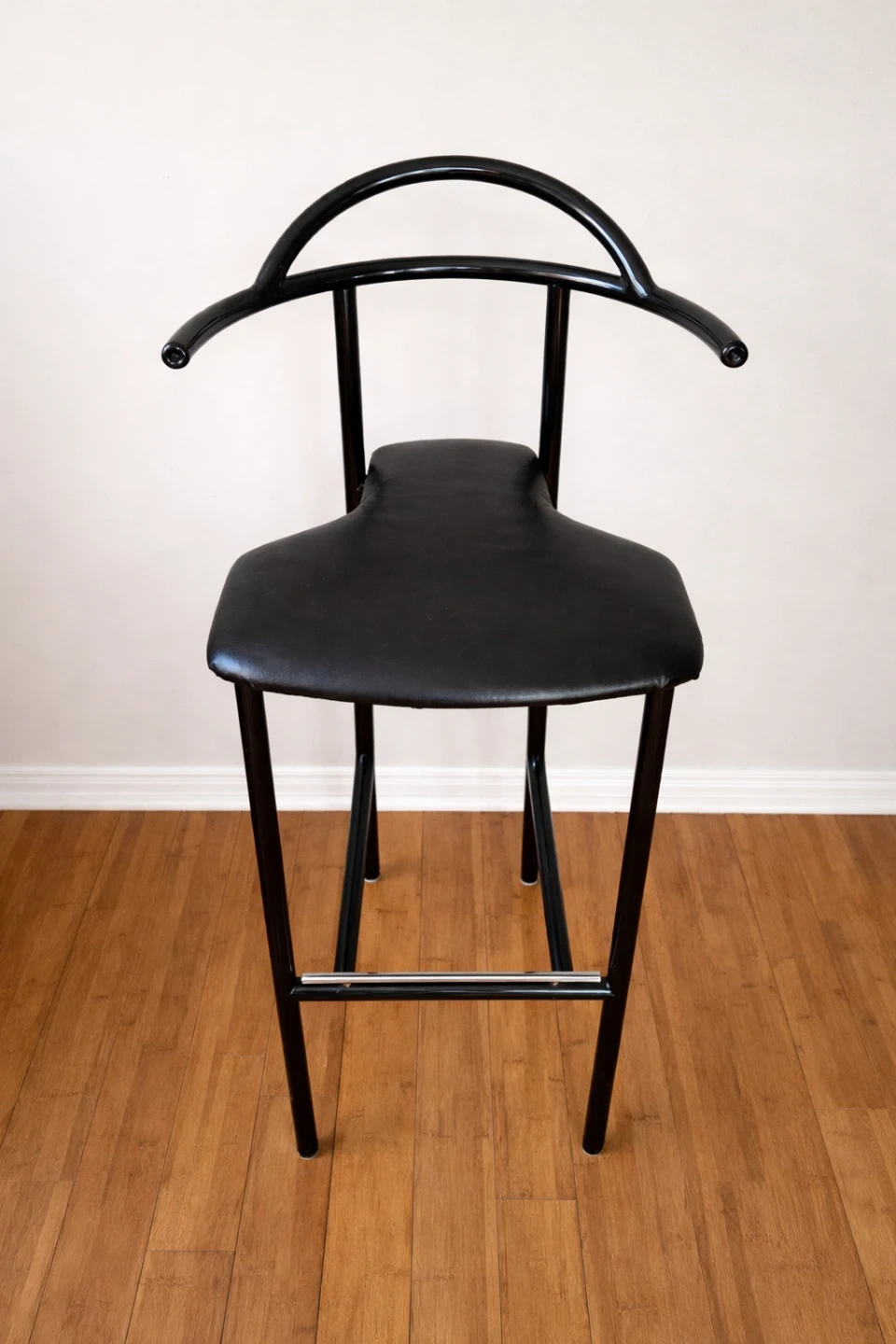 Sleek black bar stool with a cushioned seat and curved arm/back design for extra comfort. Great for kitchen islands or bar setups and easy to match with any space! The sturdy metal frame keeps it stable while still feeling lightweight and easy to move.