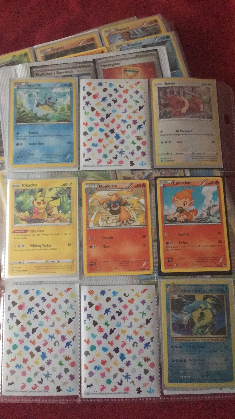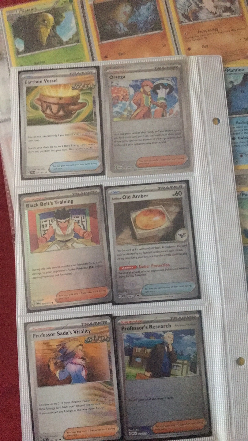 Collection of assorted Pokemon trading cards. Includes trainer cards like Professor's Research, Judge, and Ortega. Also features Pokemon like Pikachu, Eevee, and Gyarados. Cards are kept in a binder.