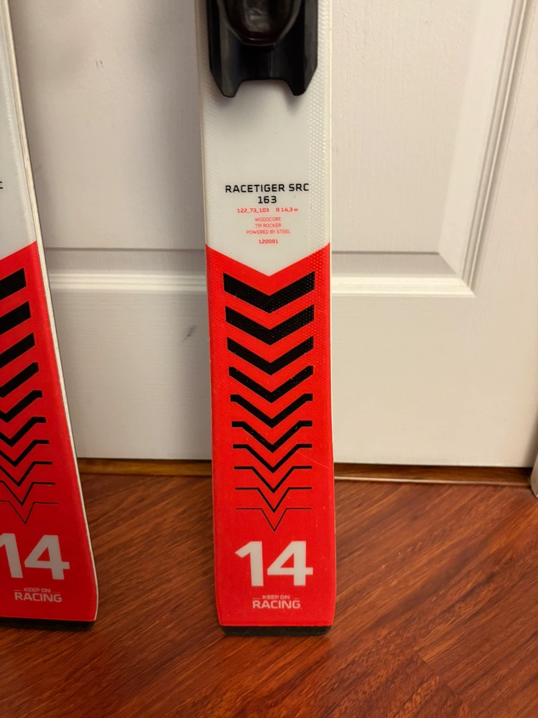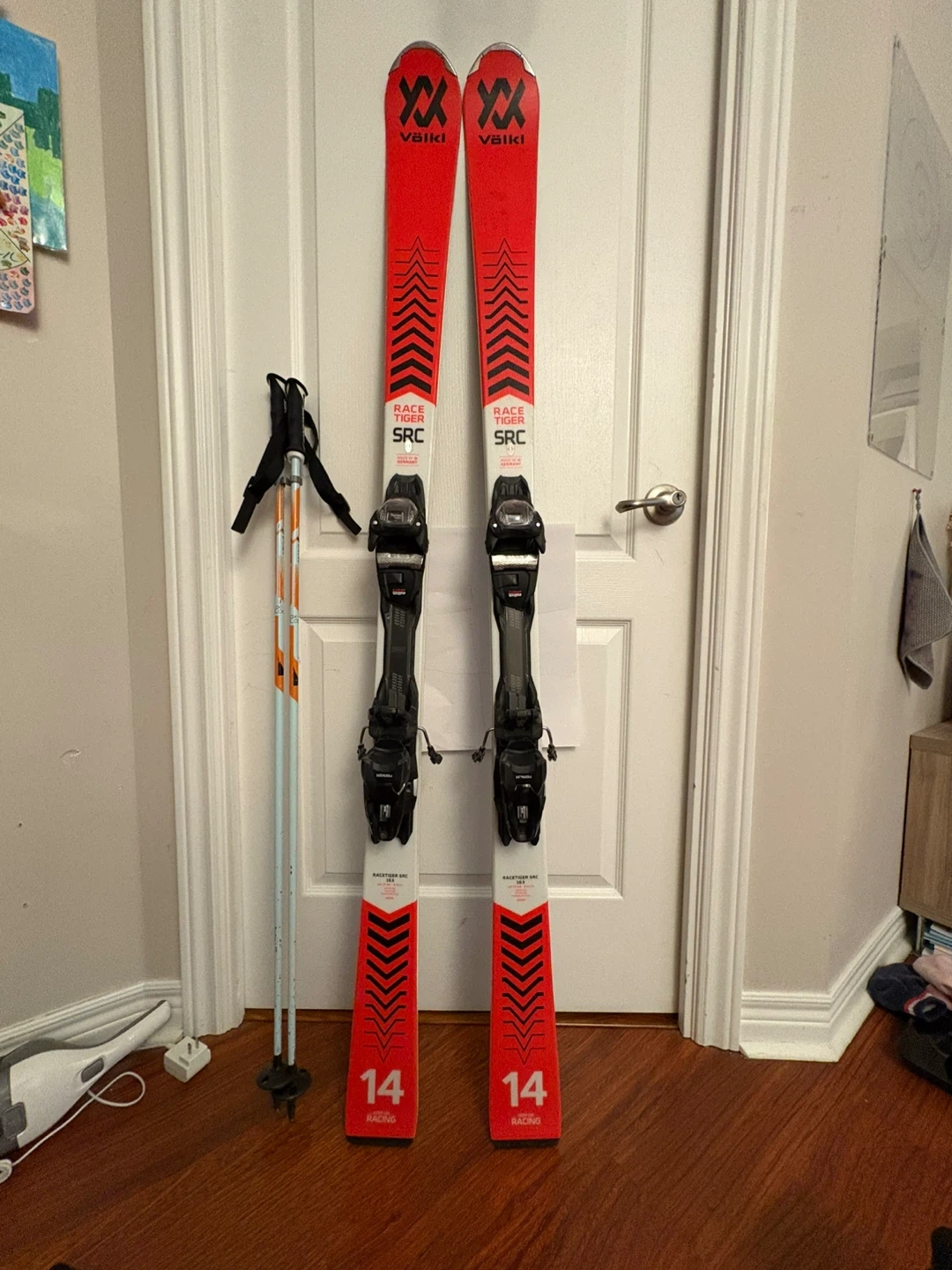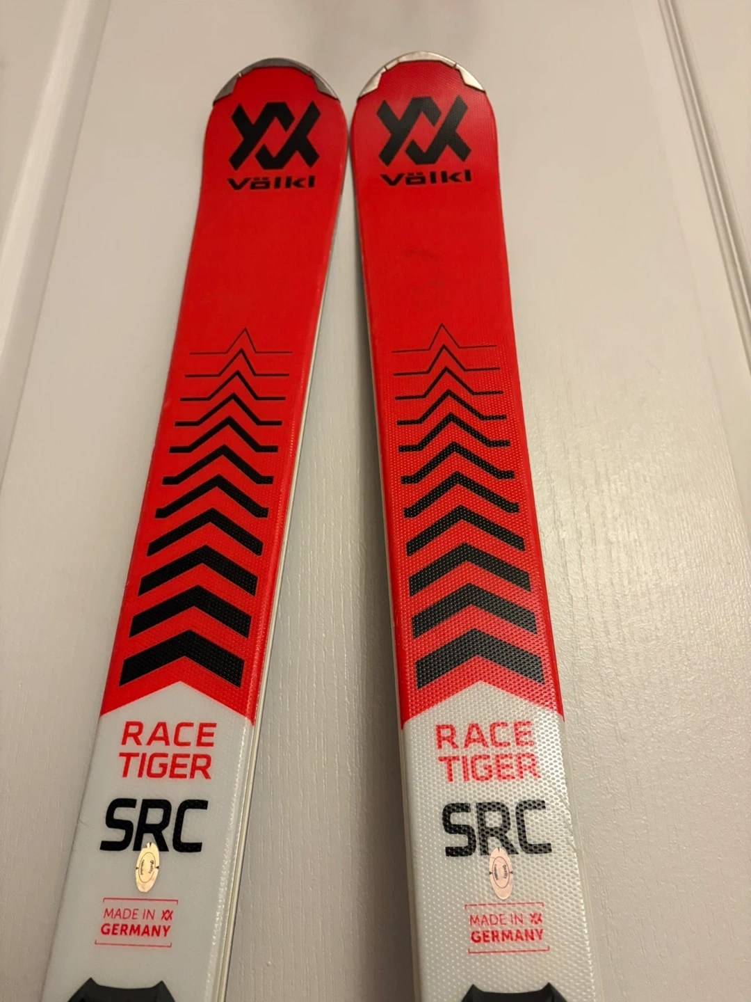 Selling a pair of Volkl Racetiger SRC skis, size 163. They come with Marker Motion 10.0 bindings and ski poles. These skis are made in Germany and are ready for the slopes!