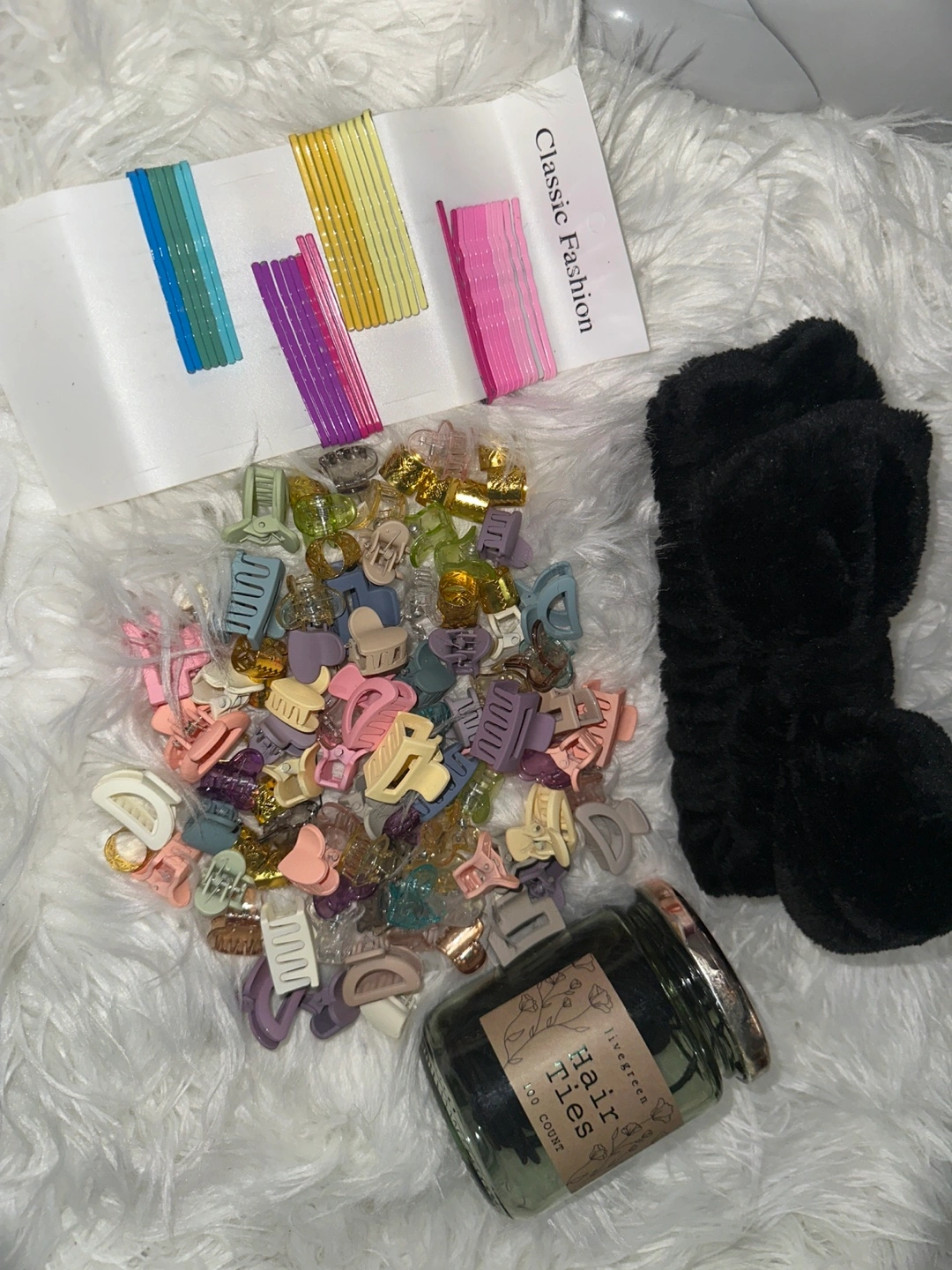 Selling a bundle of hair accessories! Includes a black headband, a jar of 100 hair ties from Livegreen, and a variety of colorful hair clips and bobby pins from Classic Fashion