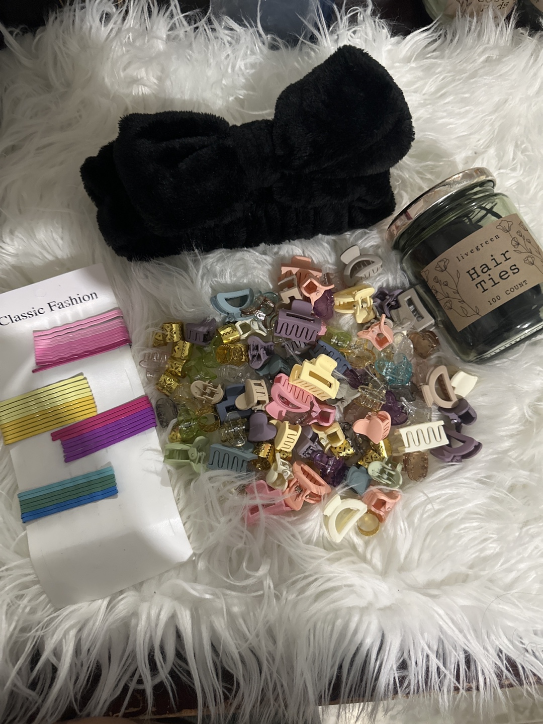 Selling a bundle of hair accessories! Includes a black headband, a jar of 100 hair ties from Livegreen, and a variety of colorful hair clips and bobby pins from Classic Fashion