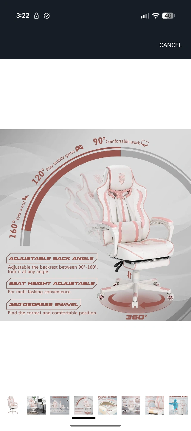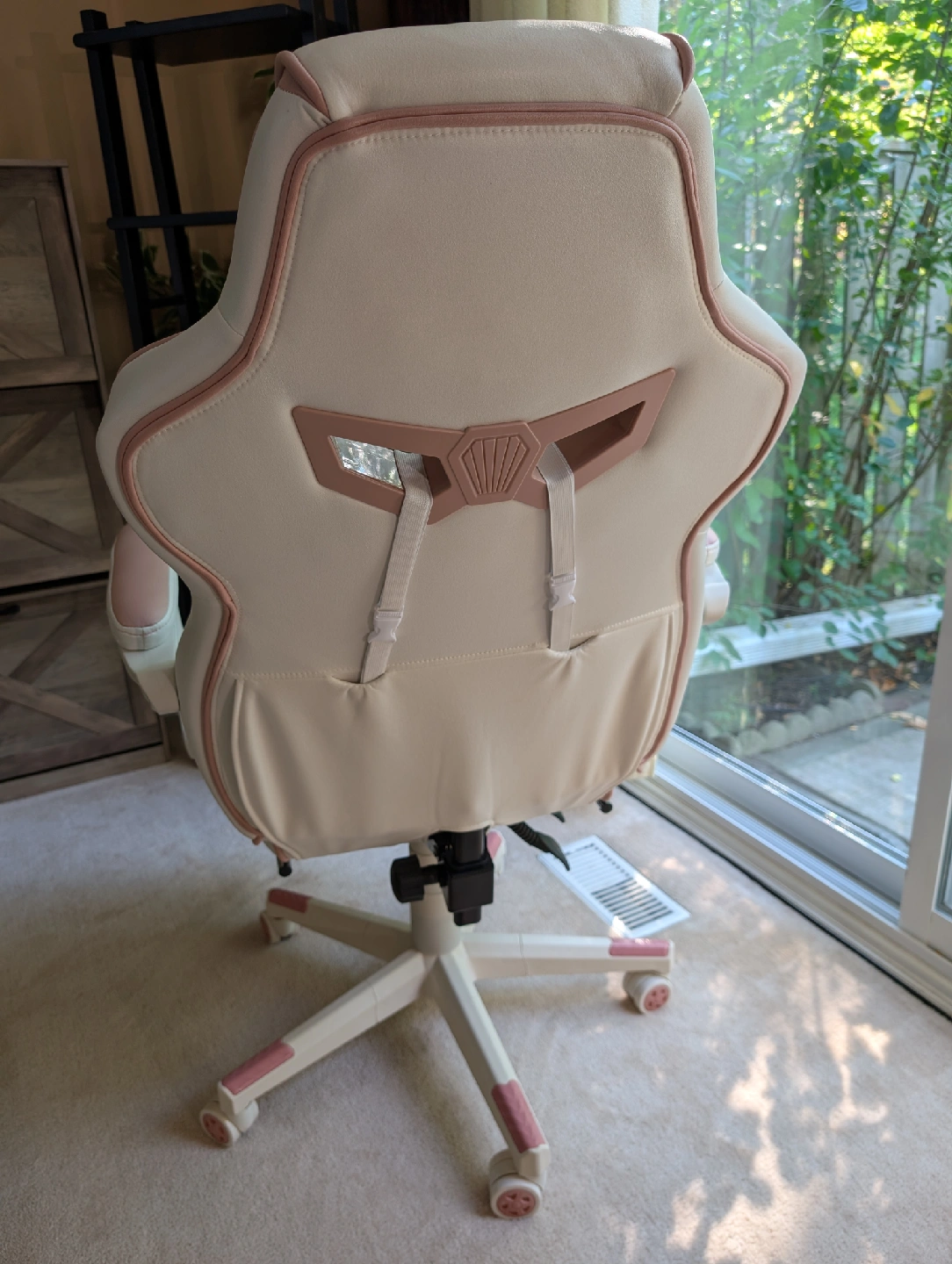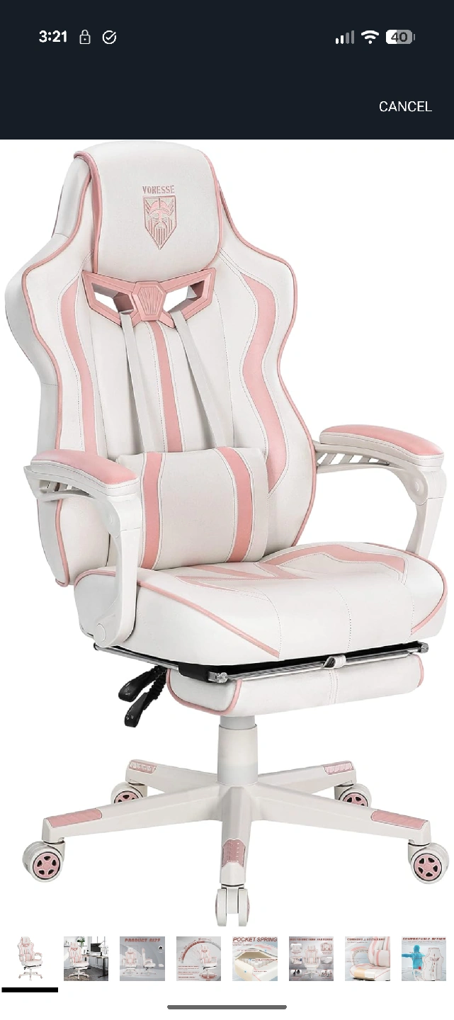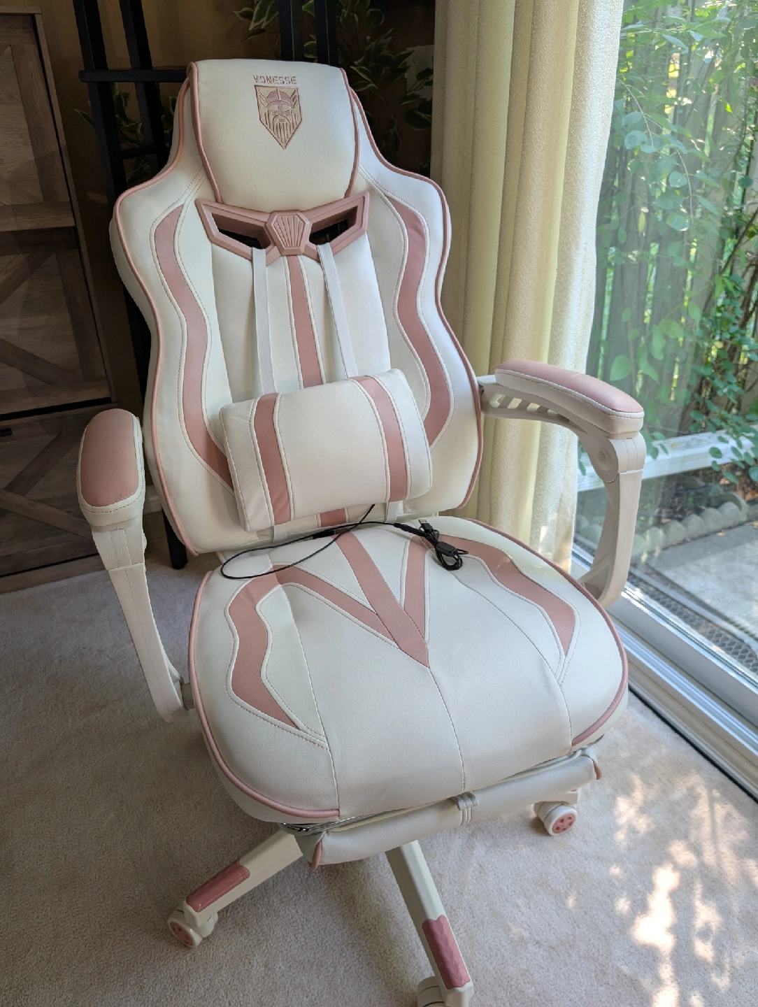 Looking to sell this Vonnesse gaming chair in a stylish pink and white colour scheme! It features an adjustable back angle, seat height, and 360-degree swivel for maximum comfort. The chair also comes with an integrated padded headrest, adjustable massage lumbar cushion, linkage armrest, and retractable padded footrest. It's designed with soft and breathable fabric, strong-supporting springs, and high-density foam for ultimate support! Dimensions are roughly 27.1" wide, 28" deep, and 44.29-48.03" high, with a load capacity of 300 lbs
